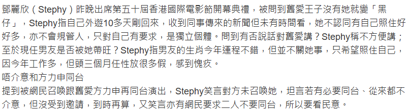 邓丽欣回应王子逃兵役邓丽欣说不介意和方力申同台 邓丽欣接受采访时被问及王子逃兵役一事,她表示外游十多天,才刚回港,收到同事传来新闻但没有看。问有没有话对旧爱说?她称不方便说太多。被问及和方力申同台,她表示不介意,「但真的没收到邀请,到时再说!」