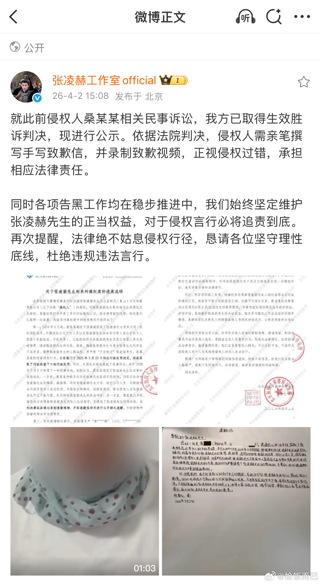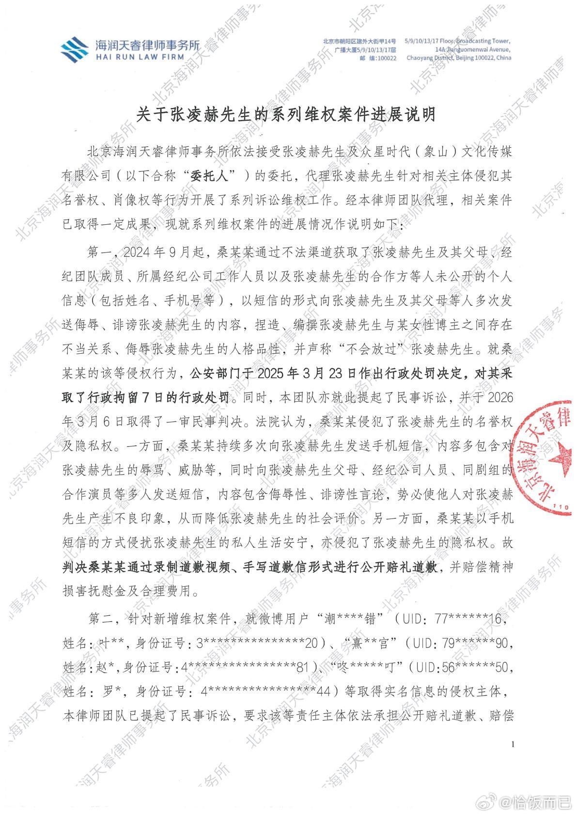 张凌赫工作室告黑维权案件进展说明