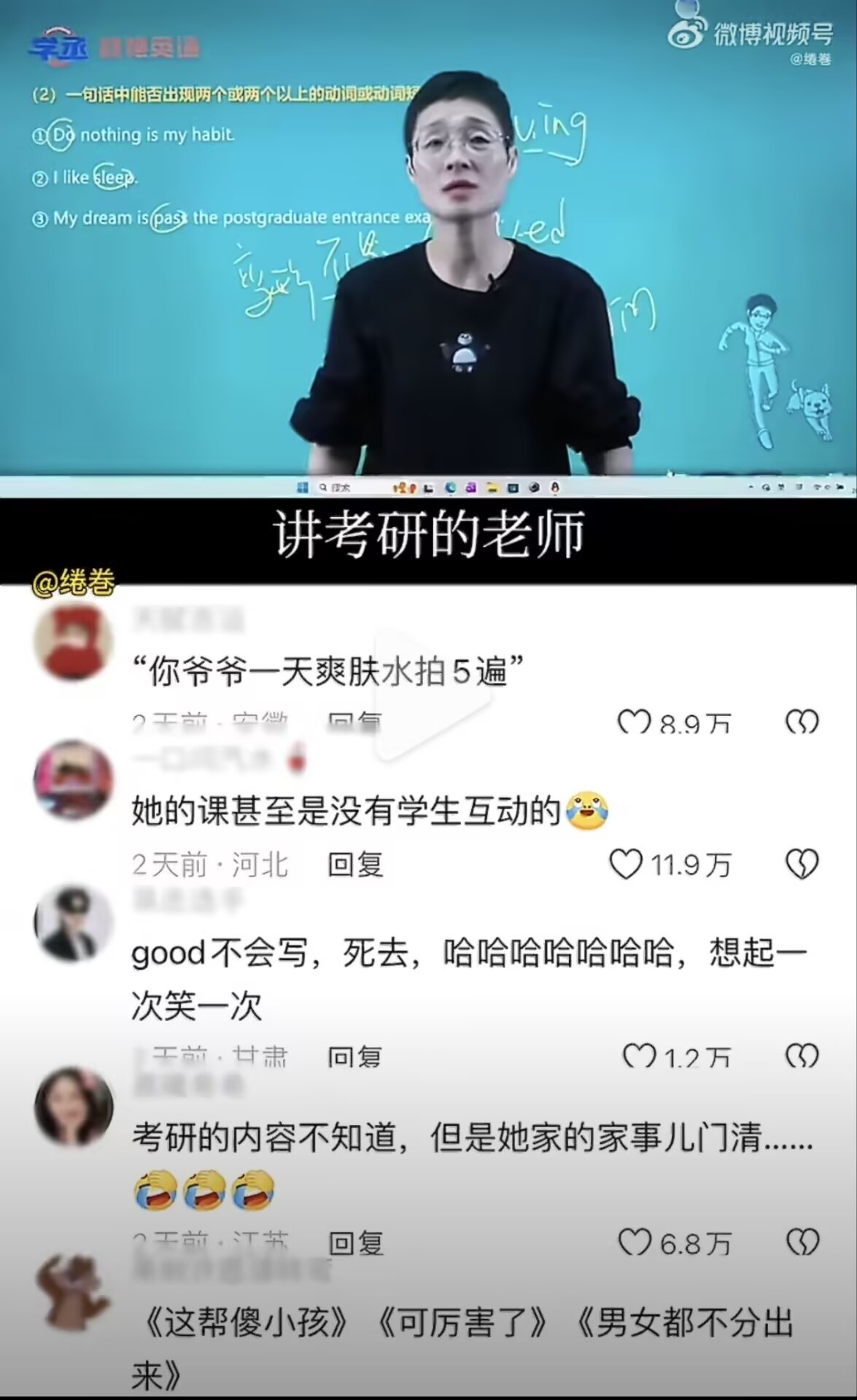 一个人对着空镜头讲课,没学生互动也全程投入。还记得刘晓艳老师的那句“人能偷懒混日
