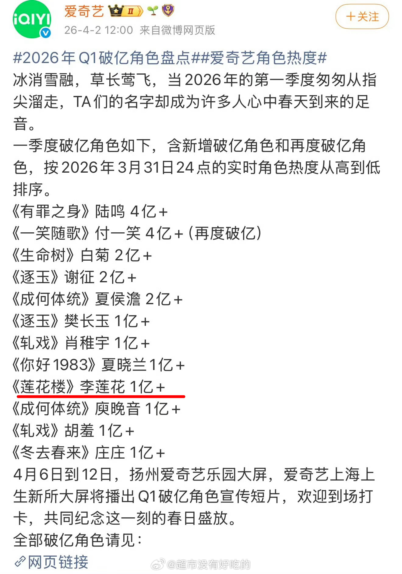 2026年爱奇艺第一季度角色破亿盘点成毅《莲花楼》李莲花Q1角色热度再次破亿上榜优质口碑爆剧长尾生命力的体现,李莲花伟大成毅成毅
