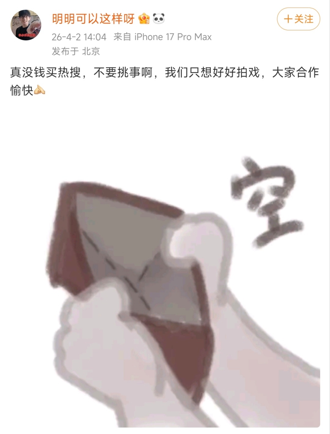“真没钱买热搜,不要挑事啊,我们只想好好拍戏,大家合作愉快”