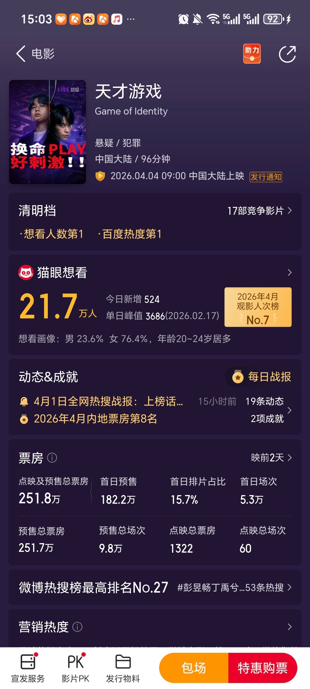 丁禹兮周六上二番电影天才游戏,目前预售200万+