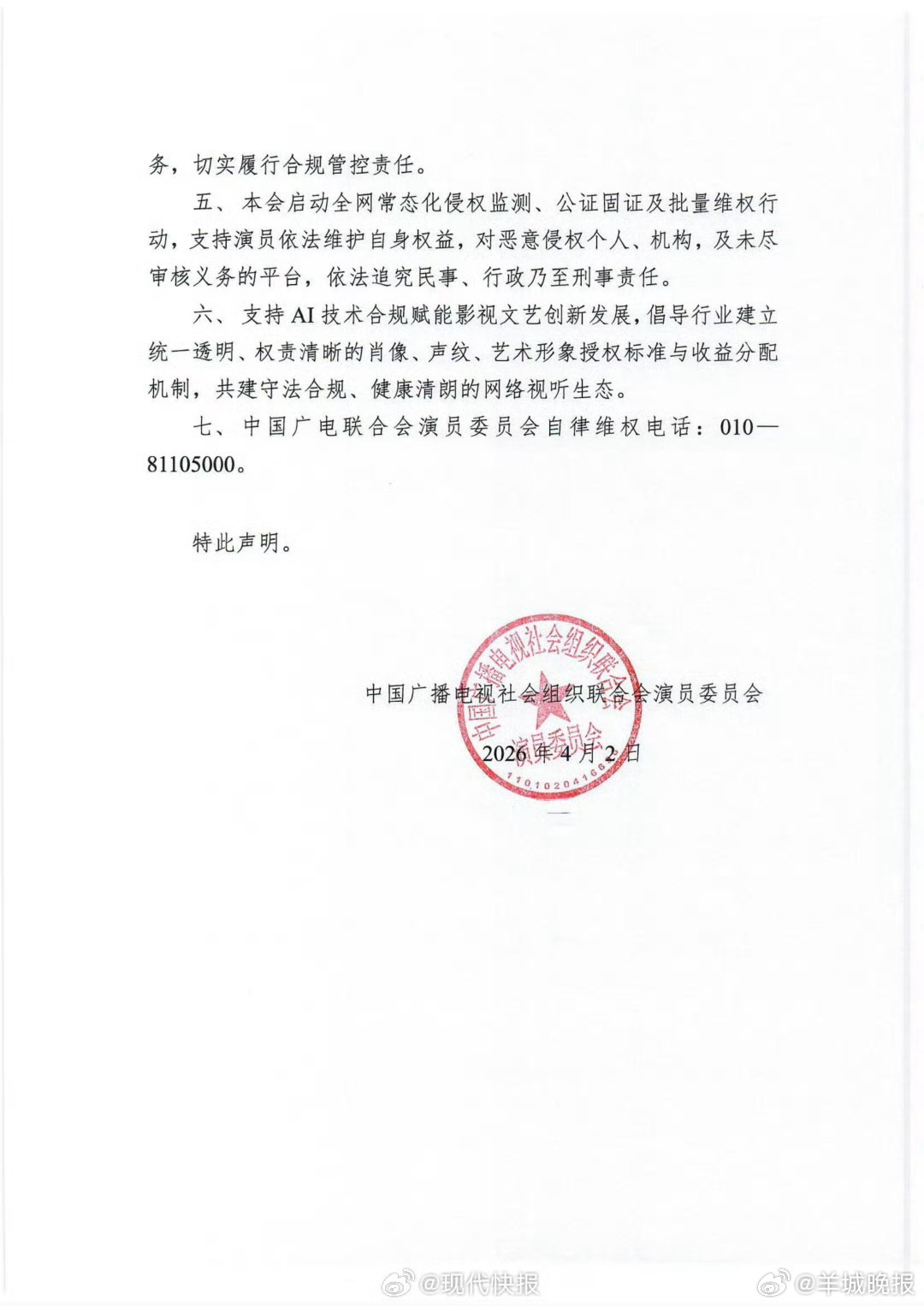 【#中广联演员委员会就AI侵权发声明#】4月2日,中国广电联合会演员委员会就当前AI换脸合成、声纹克隆复刻、影视素材任意纂改、魔改、擅自抓取演员影像声频用于AI模型训练等侵权行为发声明。戳↓(现代快报)更多消息:#网友质疑李荣浩撒谎##佟晨洁魏巍离婚##张杰回应张凌赫送花篮##迅猛龙回应穿比基尼##再见爱人15对be了11对##曝张婉婷是意外怀孕#(编辑:惠天骄;审签:周乐瑞)