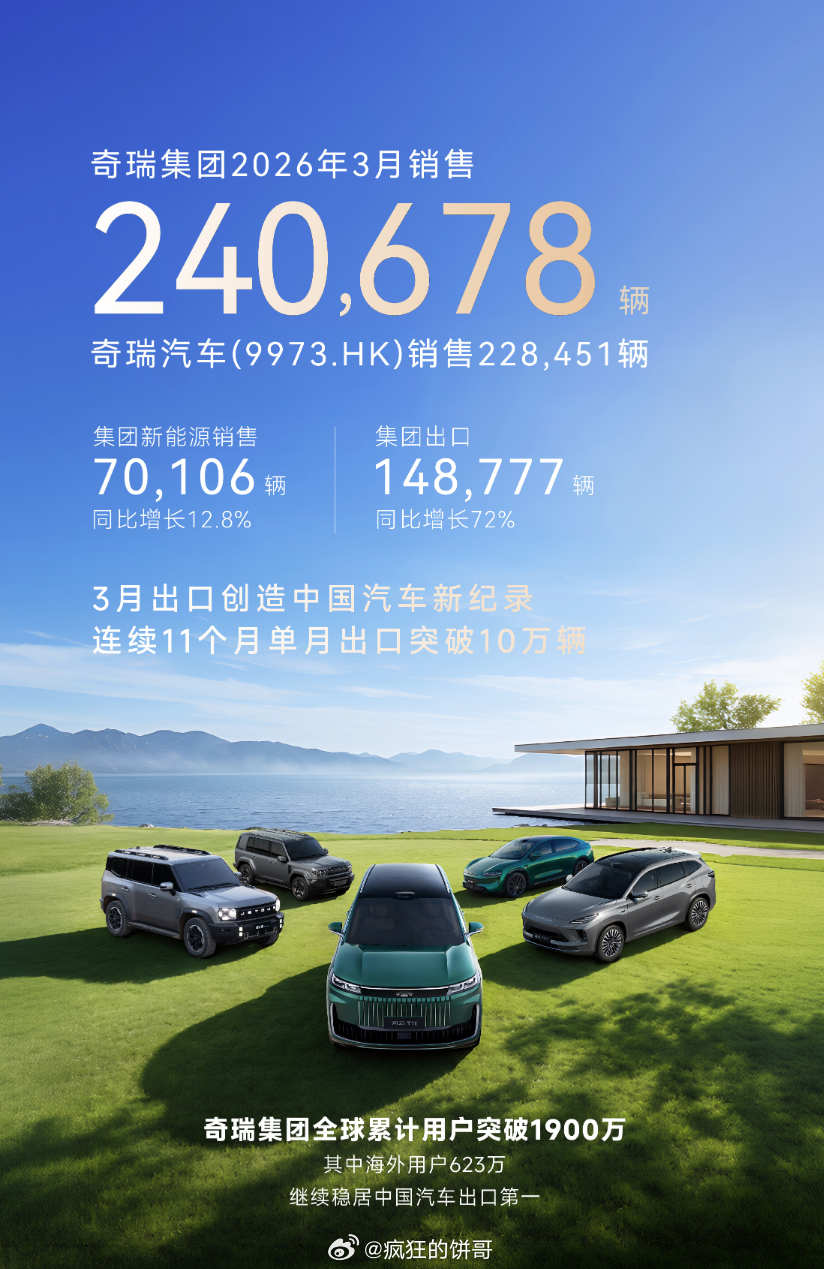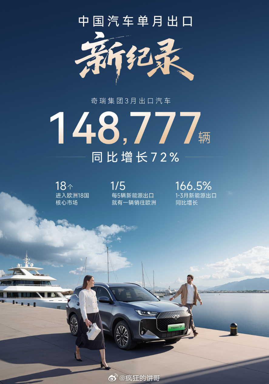 今天奇瑞港股大涨15%,3月份销量24万辆,而且同比去年还都增长的,另外出海奇瑞确实杀疯了,单月出口近15万辆销量,出口同比也是大幅的增长。