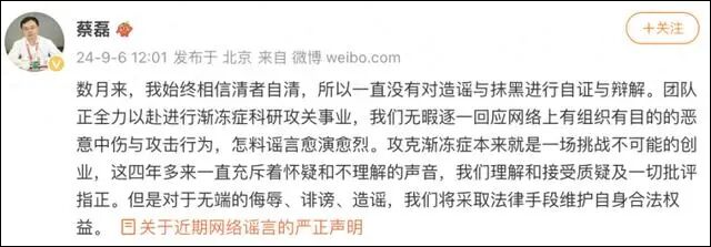 2024年9月6日,蔡磊曾在个人社交账号上发布《关于近期网络谣言的严正声明》,声明指出,多起关于蔡磊夫妇的诽谤及侮辱性言论在网络上广泛流传,累计阅读量数千万人次,严重侵犯了蔡磊夫妇的人格尊严。