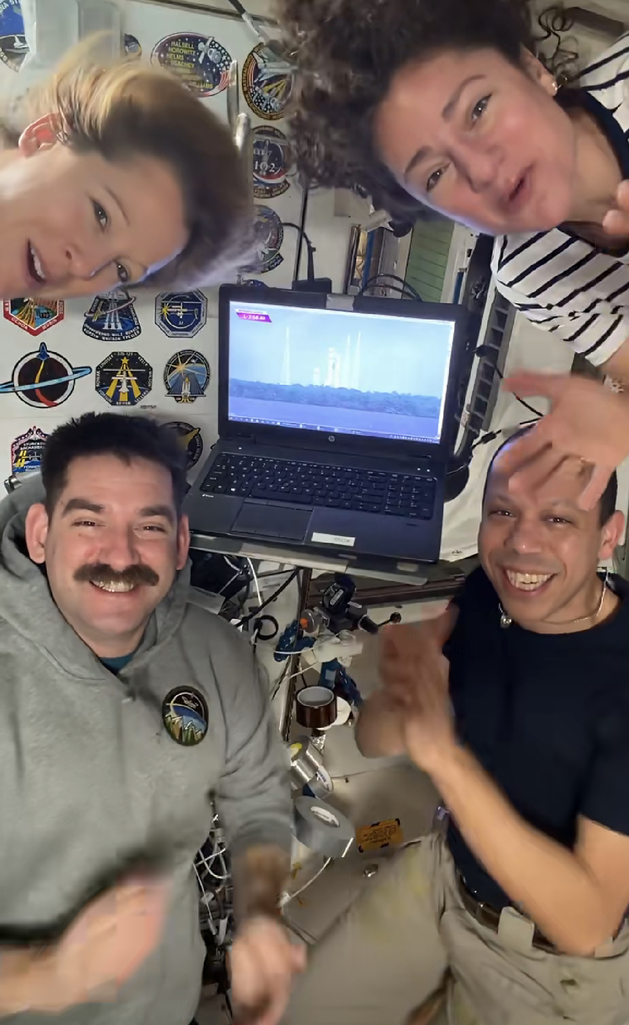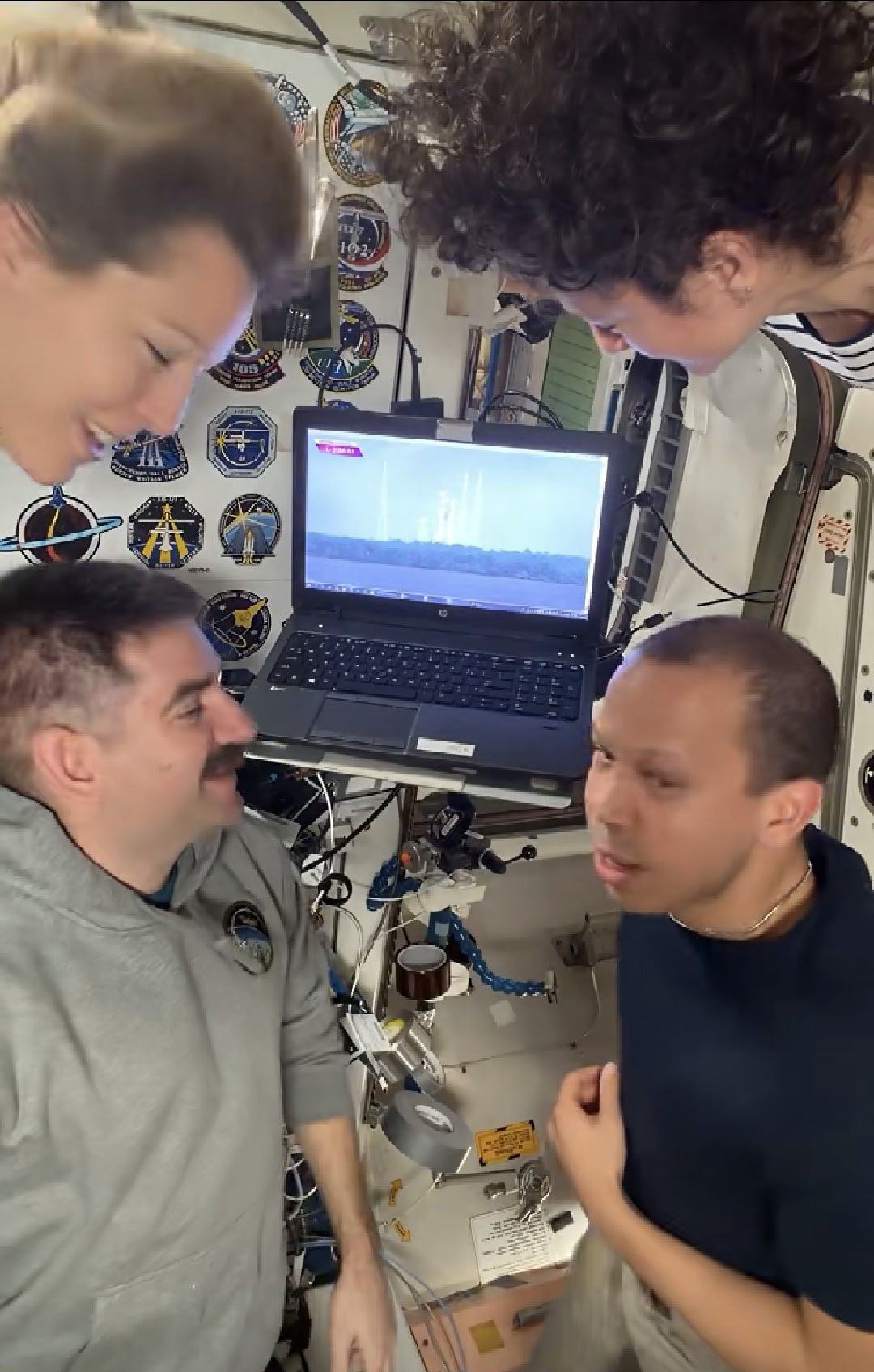 国际空间站的航天 四名宇航员收看了今天阿尔忒弥斯2号 发射直播!并祝阿尔忒弥斯2号Godspeed Artemis 嘿嘿!