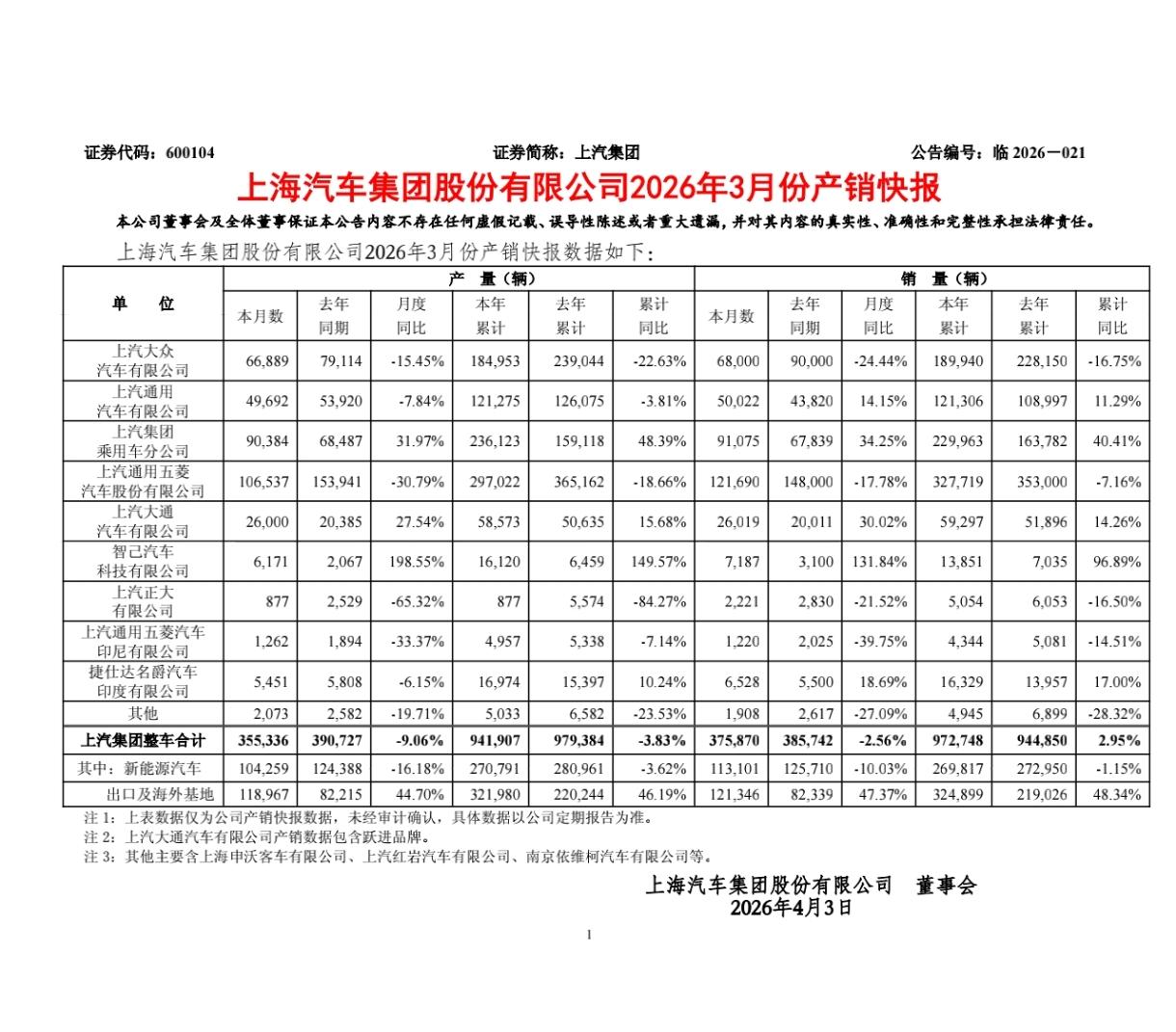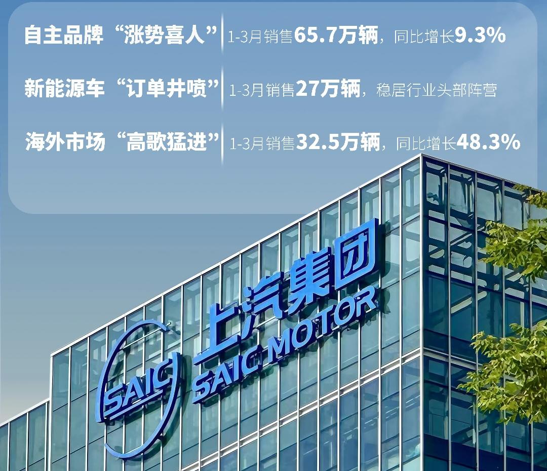 上汽集团3月份销量375870辆,同比下降2.56%;一季度累计销量972748辆,同比增长2.95%;这就意味着,上汽集团是3月份的销量冠军,也是一季度的销量冠军。 作为对比,比亚迪3月份销量30万辆,一季度累计70万辆;吉利汽车3月份销量23.3万辆,一季度累计70.9万辆。 具体到各个单位: ●上汽通用五菱3月份销量121690辆,一季度累计32.77万辆 ●上汽乘用车3月份销量91075辆,一季度累计23万辆。 ●上汽大众3月份销量68000辆,一季度累计18.99万辆。 ●上汽通用3月份销量50022辆,一季度累计12.13万辆。 ●上汽大通3月份销量26019辆,一季度累计5.93万辆 一季度,上汽大众和上汽通用合计41.99万辆,占比43.17%,自主品牌销量占比56.83%。