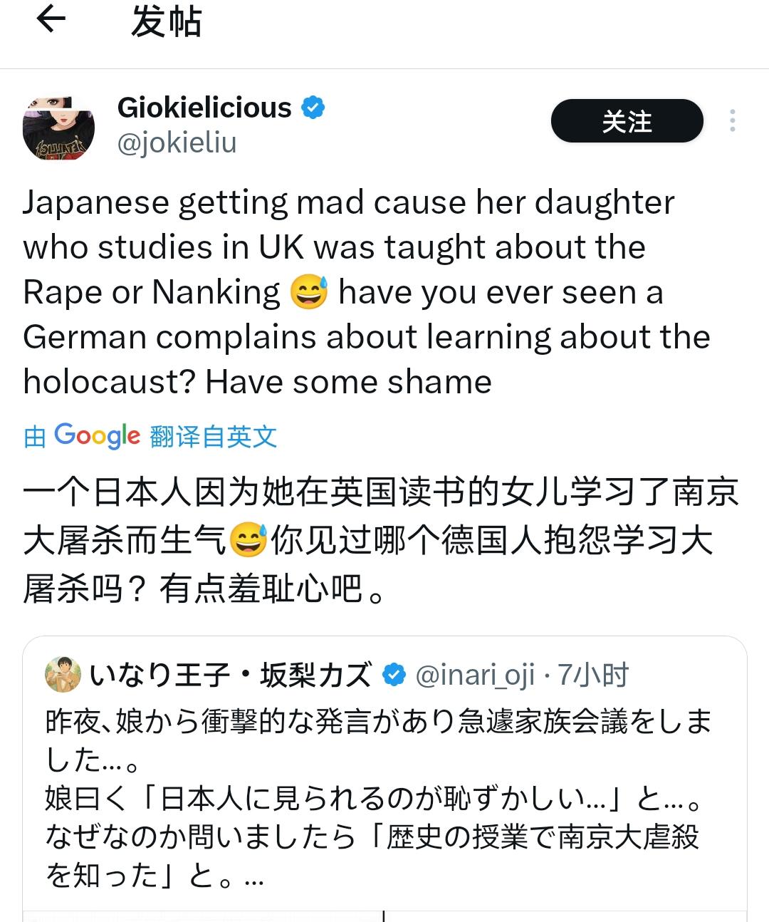 女儿被国际学校“洗脑”,日本右翼家长焦虑了! 一对日本夫妇在X上吐槽,说读国际学校的女儿从英国老师那里学了南京大屠杀,竟说“被日本人看到很羞耻”。 夫妻俩急得开家庭会议,拿“1985年纪念馆开馆前中国没闹过”“是中国 propaganda”“日军没理由屠杀”这套话术给女儿“纠偏”,甚至翻出《纽约时报》当年的某篇报道试图断章取义。结果女儿根本不信,还反驳他们“这是日本视角,世界不是这么看的”。 这位父亲在推文里表达了焦虑:“这种内容被写进了海外的教育大纲里……我正在想办法,看看能不能做点什么改变这件事。” 这件事的讽刺之处是,自从马斯克打开信息茧房后,更多海外用户反而直接看到了日本长期系统性美化战争历史的努力,以及面对真相时的慌乱。 连日本左翼网友都戳穿:这位父亲根本不敢去学校抗议,只会在网上跟历史修正主义者抱团取暖。 说到底,这也正是日本在AI 大模型领域彻底失声的重要原因 ——语料库“太脏”。 当真实的世界数据涌入,经过多语言训练的 AI 会客观揭示出南京大屠杀等铁证如山的历史。这种由真相构成的 “诚实 AI”,恰恰是想要掩盖罪行的日本自民党政府最不敢触碰的雷区。 Source: X