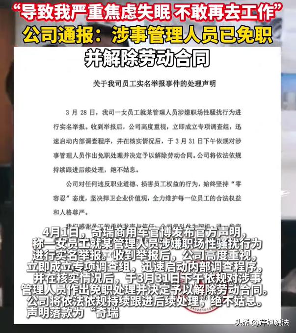 安徽,一男子在公司担任领导,招进来一位00后女员工,这位男子对女子颇感兴趣,之后不仅对女子进行言语方面的叨扰,甚至还有肢体方面的侵犯,这让女子感到非常的尴尬、无助,更多的是内心感到很可耻。上班半年来,女子只要想到这位领导的言行举止,她就排斥上班,甚至还产生了心理焦虑症、夜晚严重失眠。 女员工实名举报之后,公司也引发了重视,发表声明:已经对这位男子展开调查、绝不姑息。 浪涨新闻4月1日报道了这则新闻。 职场上,就像是一个大家庭,大家工作在一起,就难免会有交集、接触。但是如果有人借此存有不轨之心、打破了这个规则,那就必定要接受法律的严惩。 一位年轻的00后女子张女士(化名),在某一家汽车销售管理公司里上班。 张女士正值青春大好年华,正是努力奋斗的年纪。谁知道,她进入公司之后,却遭遇了令自己很反感、很恶心的事情。 进入公司上班之后,张女士被安排在公司的事业部任职。上层一位男领导江某,就会经常介入张女士的工作对接方面。 本来还以为仅仅只是简单的工作对接,谁知道相处一段时间之后,张女士发现,这个领导江某,似乎对自己的行为不大正常。 因为有的时候,明明在处理工作,但是江某却会对蒋女士做出一些骚扰的举动,而这些行为,张女士可以明显感觉到,根本就是不怀好意! 而且还不止一次,只要江某因为工作的事情找张女士对接处理,他就会有意无意的做出身体方面的触碰。 而这些触碰,张女士可以非常肯定的是:这就是职场性骚扰。 在江某有意无意的暗示下,张女士则表示了抗拒,然而,她的态度引发上司江某的严重不满,他感觉这个张女士,简直就是不识抬举。 所以,后来的工作,江某就开始对张女士各种卡,要么就是穿小鞋,时常就会在张女士有所犯错的时候,对她进行言语攻击、故意辱骂。 这下张女士完全明白了,没有达到他的合意,他就开始报复自己了,这也算是一种职场霸凌吧。 可是张女士就是一个00后的小后生啊,没有什么工作阅历、也没有处理这类霸凌的经验,每天下班回家之后,她都会陷入沉思,不断陷入情绪循环。 长此以往,张女士患上了严重的失眠症,夜里经常就会惊醒,醒来后就再也睡不着了。 另外,每每想起江某对自己的侵扰行为,张女士也感到非常焦虑,想起来就感到很可耻,内心十分抑郁。 拥有了这则精神压迫之后,张女士已经无心再工作了,跟其他领导提出,她必须得停止工作。 为了能够维护自己的权益,张女士左思右想,她决定站出来,她准备实名举报这位江某。 当江某被曝光之后,其他女员工也都纷纷声讨,一些同事也表示,他们都或多或少的遭到江某同样的骚扰。 另外,还有部分员工表示,这位江某在公司还有其他的一些不良行为。 如今,这家公司的上层收到举报信之后,已经发布的公开声明,表示会启动调查程序。最后核查,情况属实,已经将江某做出免职处理。 公司表示,后期还会继续跟进处理,绝不会姑息。 这个事件,最让人生气的,就是这个江某的行为,他已经构成违法;而更令广大劳动者欣慰的,是公司的处理态度,体现了其法治意识、管理担当、以及对员工权益的切实保障。 根据《民法典》第一千零一十条规定,违背他人意愿,以言语、文字、图像、肢体等行为实施侵扰的,受害人有权请求行为人承担民事责任。 不仅仅是言语方面、肢体接触等、或者是持续发侵扰信息,也足以构成法律意义上的侵扰。 江某的行为已经触犯了《治安管理处罚法》,根据规定,他会被处以5-10日的行政拘留,后期还需要视情况严重程度,考虑是否刑事立案。 另外,公司“霸气出击”,这处理方式,也是很得人心。 《民法典》和《妇女权益保障法》均规定,企业必须采取合理措施预防和制止职场骚扰。 面对女员工的权益遭受侵害,如果公司置之不理、不作为,将要承担连带的民事赔偿责任,甚至还要接受行政处罚。 所以本次公司果断的处理态度,正是履行法定义务的体现,也有效的避开了法律跟声誉双重风险。 公司不“和稀泥”,员工的权益才能得到保障,给劳动者撑腰,这一点确实值得肯定和点赞。 对于此案,大家都怎么看呢?