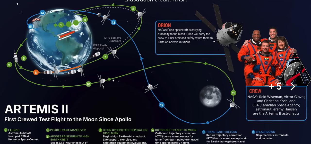 四名宇航员,在猎户座飞船的内景公开了,图1图2,看看像不像? 阿尔忒弥斯2号发射的时候,没有给飞船内部的画面,但是在船舰分离之后,NASA公开了宇航员的画面。 从视频中看,虽然看不清宇航员的全貌,不过神情好像还挺放松的。只是,飞船外面好像是一片漆黑,不知道飞到哪里了。 看图5的示意图,现在应该是进行到第6步了。总共15步,看看能不能顺利走完。