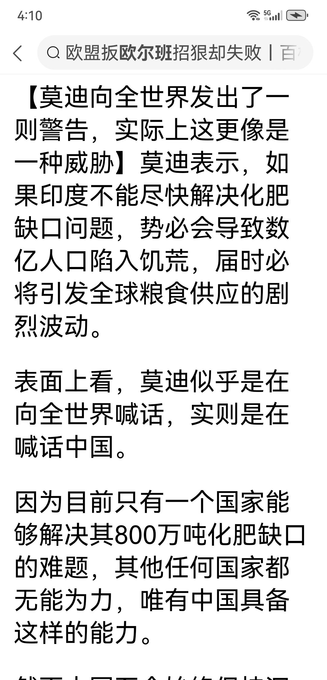 老仙声称要自杀,世界各国说:好害怕!只有帮忙收尸了。 印度发展困局 莫迪表示,如果印度不能尽快解决化肥缺口问题,势必会导致数亿人口陷入饥荒,届时必将引发全球粮食供应的剧烈波动。