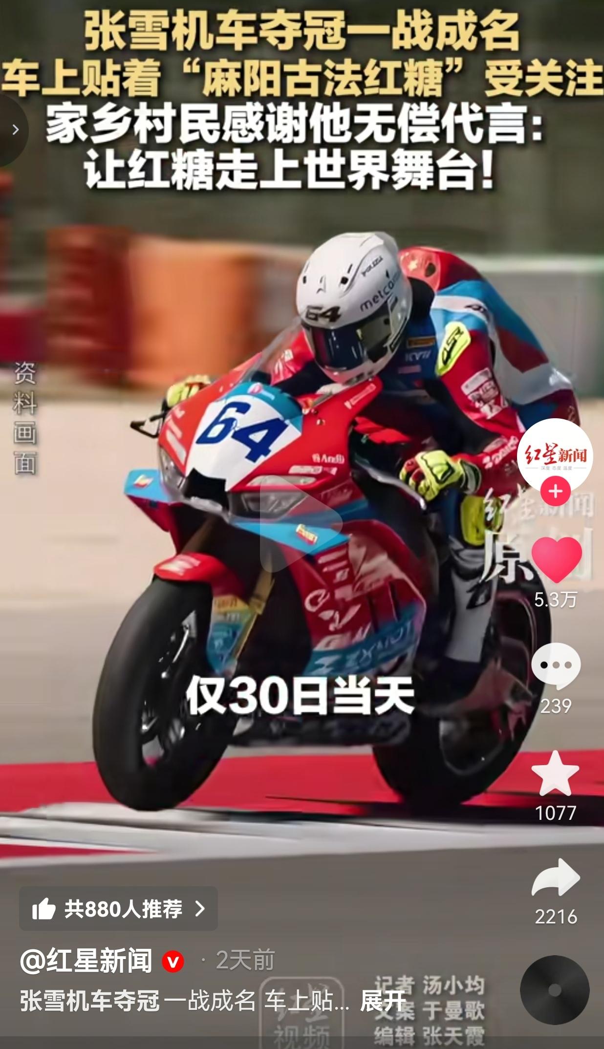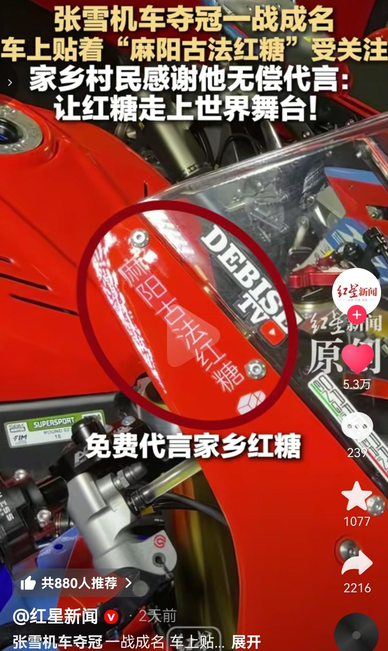 太暖心了!湖南怀化麻阳的机车手张雪,夺冠一战成名后,居然把麻阳古法红糖贴在机车上,让家乡的土特产直接火遍了全世界!网友:这才是真正的顶流,这才是最牛的爱国情怀! 3月29日,张雪在国际赛场上一骑绝尘,拿下冠军,一战封神。可细心的网友很快发现了一个戳心的细节:他的夺冠机车上,赫然印着“麻阳古法红糖”几个大字! 赛车是什么地方?那是全世界顶级的竞技舞台,能贴在车身上的,全是国际大牌、天价赞助。 可张雪偏不,他把最接地气的家乡特产,印在了最显眼的位置。他每一次过弯、每一次加速,都在向全世界宣告:中国不仅有机车速度,还有中国品牌、中国味道! 这份暖心的背后,藏着最实在的乡情。张雪是湖南怀化麻阳县人,狮子湾村就是他的家乡。村里种着几百亩甘蔗,每年能产出七八十吨古法红糖,可再好的东西,也愁销路。 今年春节前,张雪和团队回村,跟村民们坐在一起吃饭,聊起了红糖卖不出去的难题。当时张雪二话不说,直接拍板:我无偿给你代言!一分钱不要! 就这么简单一句话,他把家乡的红糖,直接带进了世界赛场。 冠军的影响力有多恐怖?仅3月30日夺冠当天,村里的红糖就卖了近300单!原本要卖大半年的货,硬生生比往年快了2个月售罄,现在全村的红糖已经全部卖光! 村支书张岩宏拿着红糖,对着镜头笑得合不拢嘴,全村老人拉着镜头连连感谢:“张雪,感谢你啊!让红糖走上了世界舞台!” 消息一出,全网彻底沸腾了,评论区全是对张雪的夸赞和感动,有的网友说:这才是真正的冠军!车贴比任何奢侈品广告都好看!把家乡特产带上世界赛场,这波操作我给满分! 也有的网友说:太牛了!不是利用冠军效应疯狂捞金,而是回头帮家乡带货。这种冠军,才是真正的正能量,比那些只会炫富的网红强一万倍! 还有的网友说:看到那几个字,我鸡皮疙瘩都起来了。这就是中国年轻人的样子,有实力、有情怀,走到哪都想着家乡! 也有的网友说:太实在了!无偿代言,不求回报,就为了帮村民把红糖卖出去。这样的冠军,我们必须支持到底! 说实话,我看完这个事,真的心里热乎乎的。现在太多人,火了之后就想着怎么变现,怎么割韭菜。 可张雪呢?他夺冠了,火了,第一时间想到的不是给自己接多少天价广告,而是把家乡的好东西推向世界,帮全村的老百姓把日子过好。 他这哪里是赛车?他这是骑着摩托车,给家乡做宣传,给中国的乡村做推广!他用自己的实力和影响力,证明了什么叫“冠军荣耀,反哺家乡”。 那些印在车身上的红糖,不是简单的广告,那是乡愁,是担当,是中国青年的志气。在这个国际赛场上,他不仅赢了比赛,更赢回了属于中国的味道,赢回了属于家乡的希望。 冠军的奖杯值得骄傲,而冠军心里装着家乡的这份情怀,更值得所有人的尊敬! 真正的顶流,从不是高高在上的光环,而是把自己活成一束光,照亮家乡的每一寸土地! 对此,你怎么看?