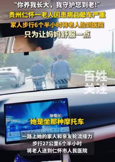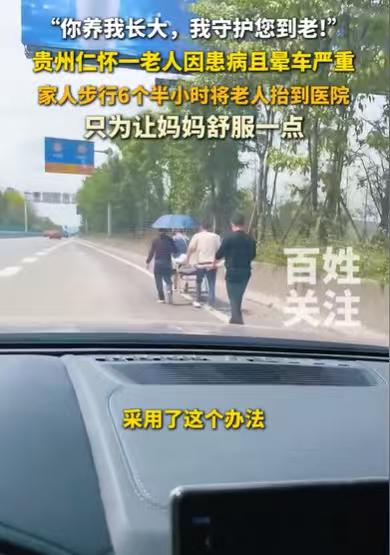 贵州仁怀,81岁的老母亲生病,要去看医生,路程有27公里,可她却严重晕车,坐摩托车晕车,就连坐人力车,她都晕车,儿子为了不让母亲晕车,不让她血压增高,导致血管瘤再出血,他决定用担架抬母亲去医院,27公里的路程,他和亲友花了6个半小时,将母亲抬到医院。 徐恒兴看着自己的老母亲,生病严重了,又要去看医生了,他一想到母亲要坐车去医院,在路上会晕到吐,他就很心疼母亲。 说起他母亲的晕车,她真的是太严重了,如果只是坐汽车或者小车晕车,这都是很常见的事情,他的老母亲很夸张,坐摩托车都会晕车,甚至坐那些人力车都会晕车。 要是平时,母亲身体好的时候,要出远门,他也没办法顾虑太多,可能用摩托车搭着母亲就走。 可现在他母亲的病情,可不能有半点疏忽,他母亲晕车严重,血压还高,一旦坐车,血压高起来,血管瘤就会出血,母亲就会很危险。 他想着母亲的晕车,他又看着母亲生病难受的样子,他一时不知所措,不知道该如何把母亲送到医院。 他是真不想让母亲在生病的时候,再去遭受那晕车的痛苦,他非常能切身地感受到,母亲晕车有多么的难受。 可母亲不坐车,他就无法把母亲送到医院,从他家到医院有27多公里,这个距离可不是一个小距离,坐车都还得几十分钟呢! 他真不知道该怎么办了,他不希望母亲晕车,也不希望母亲病情加重,可医院的路程又那么远,母亲又不能走这么长的路。 眼下,如果要把母亲送到医院,既不让母亲晕车,又不用母亲走路,那只能用担架抬母亲去医院。 徐恒兴想到这个方法,自己拍了一下大腿,觉得这是个好办法,他让母亲在担架上,他抬着母亲去医院。 这样母亲既不会晕车,还能欣赏沿途的风景,让她心情变好,身上的病也能好得快一些。 只是为难了徐恒兴,27公里的路程,徒步到医院,还得抬着他的老母亲,这真是太为难他了。 但为了母亲不晕车,为了母亲能够舒服一些,他只能选择这个方式送母亲去医院。 单靠他一个人,肯定不能把母亲抬去医院的,他只好找几个亲友,欠下这份人情,抬着他的老母亲去医院。 路上,一个老母亲,被儿子和亲友们抬着,那一刻,或许她会感到自己是这世上最幸福的母亲。 有多少个儿子,能够做到这一点,恐怕这世上找不出几个。 仅仅只是害怕母亲晕车,就用担架抬母亲去医院,27公里的路程,耗时6个半小时,若没有那份孝心,无人能做到这一点。 百善孝为先,徐恒兴是真的用自己的行动,解释了这句话。 27公里的路程,用6个半小时,抬着母亲慢慢地到医院,他用自己的行动,诉说了他的孝心,诠释着他的孝心。 他说,母亲养我长大,我守护您到老,他做到了,他做了一件许多人都做不到的事情。 人们常说,久病床前无孝子,这是对儿女们的考验,但徐恒兴用自己的行动来诉说他的孝心,很多人相信,徐恒兴能做到这一点。 他的老母亲81岁了,一次生病就抬着老母亲到医院,人老了,总会遇到有生病的时刻,总会要到医院去看医生。 或许他的老母亲,一听说去医院要坐车,就已经有心理负担了,现在儿子能够抬着她去医院,来自儿子给她的动力,或许比吃药还强,她是幸福的。 徐恒兴如此孝敬母亲,他一定是在母爱中成长,小的时候能得到母亲那无怨无悔的付出,他才会如此深爱母亲,愿意为母亲,付出自己全部的孝心。 一个爱儿子的母亲,一个爱母亲的儿子,他们都深深地爱着对方,并且用行动来诉说自己的爱,可见他们家是有着优良的家风的。 《民法典》第1043条规定:家庭应当树立优良家风,弘扬家庭美德,重视家庭文明建设。 正是由于徐恒兴在母爱中长大,在家人的关怀中生活,所以他会如此地爱自己的母亲,不舍得让自己的母亲晕车,才会用担架抬着母亲去医院,成就一段母慈子孝的佳话。 那么你对这样的儿子有何看法呢?