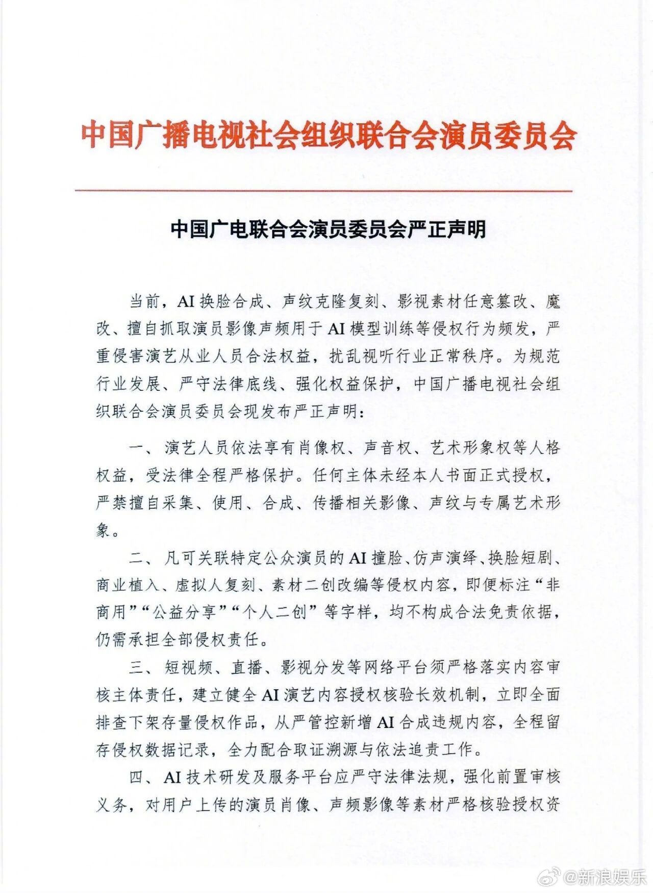 中国广电联合会演员委员会就AI侵权发声明 4月2日,中国广电联合会演员委员会就当