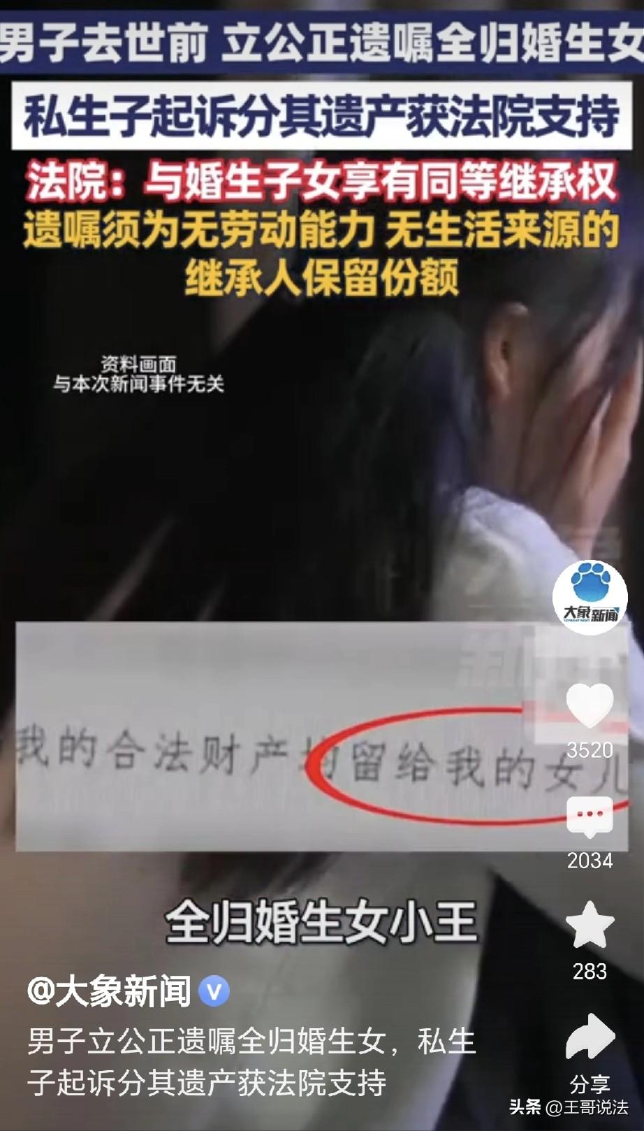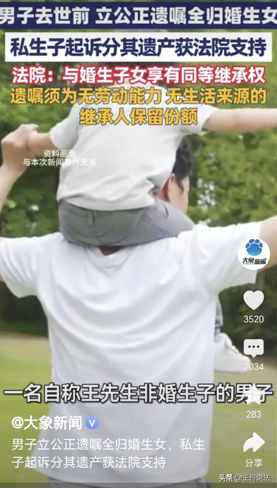广东深圳,一男子瞒着家人,在外生了一个儿子,可儿子还未成年,男子就去世了,可男子生前,立了份公正遗嘱,除了给母亲留了养老的钱,剩下的房子车子,股票存款全部留给婚生女儿,儿子不愿意了,一纸诉状告到法院,我也是第一继承人,我也有资格继承遗产!可父亲已死,女儿不愿配合做血缘鉴定,男子拿出和爷爷奶奶的鉴定,女儿傻眼,法院判了! 王先生打拼了多年,挣下了深圳的一套房产,他还投资了股票,账户里还有不少的钱。 银行卡里他也有资产,还有一辆汽车,家里的日子过得相当的不错。 他对自己的财产,立了一份遗嘱,为保证万无一失,他还对遗嘱做了公证。 遗嘱上白纸黑字: 一旦自己去世,每年从遗产里拿出10万元给自己的老母亲养老。 而剩下的所有财产,全归女儿小王所有。 遗嘱立好,王先生去世了,家人悲痛欲绝,很快就给他办完了后事。 小王拿着父亲遗嘱去办继承手续,可万万没有想到,一个男子跳了出来。 这男子自称是王先生的儿子,是王先生在婚外生的非婚生子。 男子表示,他也是父亲遗产的第一顺序继承人,因此王先生的遗产他也要继承一部分。 男子告到法院,说自己的母亲,在2016年和王先生相识,但是当时,王先生已经结婚,并生有一个女儿,就是现在的小王。 但是尽管如此,两人还是越走越近,最终发展成了男女朋友关系。 没过多久,男子母亲就怀上了孩子,肚子里的孩子就是现在告状的男子。 虽然王先生这么多年,并没有和他们母子一起生活,但是一直有过互相的联系。 王先生会问及男子的生活学习,也会关心他的身体,更会问到他就医看病的问题。 男子为了证明自己,拿出了一份司法鉴定报告,证明他和王先生的父母有血缘关系。 这也就是说,虽然王先生已经去世,但男子能够证明,他和爷爷奶奶有血缘关系。 这就相当于从侧面证实了,他确实是王先生的儿子。 女儿小王大吃一惊,她从不知道父亲竟然还有非婚生子!她觉得这事太荒唐了,她拒绝配合男子做亲缘鉴定。 但法院认为,既然小王不配合鉴定,就要承担举证不能的后果,默认这个男子是王先生的非婚生子。 这样一来,问题一下子变得复杂起来。 王先生的遗嘱是公证过的,肯定有效,而且法律规定,遗嘱继承优先于法定继承。 也就是说,按照王先生的遗嘱,女儿小王继承遗产是板上钉钉的事情。 可法律也说了,非婚生子女和婚生子女享有同等的继承权,这个男子确实是第一顺序继承人。 法官仔细审查了王先生立遗嘱时的公证录像,发现他当时思路十分的清晰。 他能明确表达自己的意愿,和公证员做交流也很正常。 这就表明,王先生的遗嘱合法有效,遗嘱的继承就必须按照他的意愿来执行。 可是,男子目前的年龄还未成年,这就更加复杂了。 因为法律有规定,必须给没有劳动能力、没有生活来源的继承人留一笔钱。 而男子刚好符合这个要求,他还未成年,明显符合这个条件。 也就是说,王先生的遗产必须要给男子保留必要的份额。 有人就奇怪了,不是说要以遗嘱为准吗?这还是公证的遗嘱!正常来说我的钱想给谁就给谁!有公证就可以了。 但法律是这么规定的: 《民法典》第1141条规定: 遗嘱应当为缺乏劳动能力又没有生活来源的继承人保留必要的遗产份额。 最终法院综合考虑了男子的年龄,成长需要,还有王先生遗产的总价值,酌定给他留了一部分遗产。 至于他要求的更多份额,被法院驳回了。 也就是说,女儿小王还是能拿到大部分遗产,但也得给这个未成年的非婚生子留一笔钱,用来保障他的基本生活。 这事也给大家提了个醒,立遗嘱的时候,一定要考虑周全。 不然看似完美的安排,最后可能还是会出意外。 而且非婚生子女的继承权,在法律上确实和婚生子女一样,不管父母有没有结婚,孩子的权利都受法律保护。 因为无论怎么说,就算王先生没去世,不管是婚生子还是非婚生子,只要是他的孩子,他都应该给未成年孩子付抚养费。 更何况他去世后,把所有的遗产都交给婚生的子女,但是他忘了,法律上是有明文规定的。 无论是遗嘱还是其他的,都必须给未成年人留下一定的抚养费。 如果他的孩子都是成年的话,那依照法律,他的财产就会优先按照遗嘱所确立的继承人来继承遗产。 对此,你怎么看?
