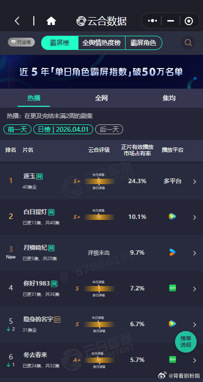 鞠婧祎《月鳞绮纪》首日云合9.7%,排名第三,刚开播一天就这么高的成绩,真的是爆