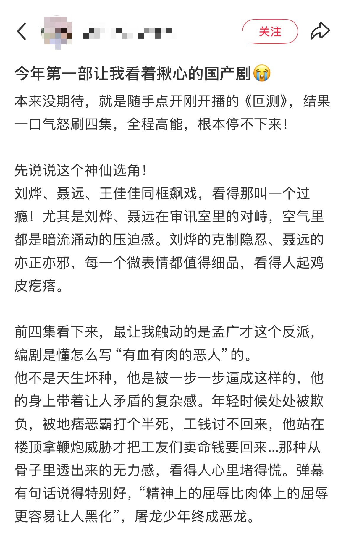叵测狂飙相似度有个网友写的剧评很好:“精神上的屈辱比肉体上的屈辱更容易让人黑化”或许会有人觉得在那么多憋屈的事情前,要黑化就应该早点黑化,可是普通人最一开始也是相信世界是美好的所以在精神一无所有时,才是放弃自我的时刻我们需要这类的作品,去展现 人 性 现 实,去探讨一些无法解决的事,因为或许在未来就能够阻止那些即将陷入绝境的人