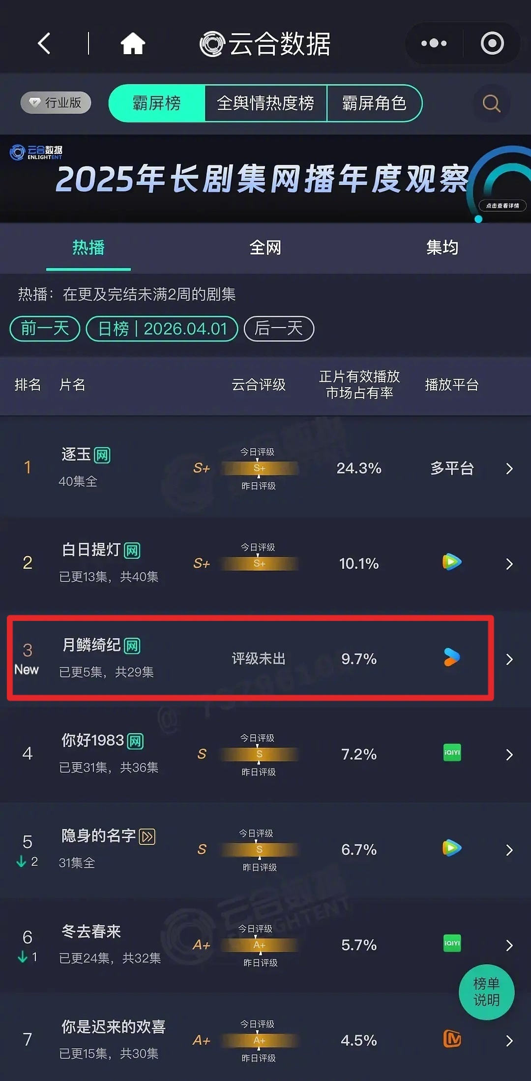 鞠婧祎、曾舜晞、陈都灵《月鳞绮纪》首日云合市占率9.7%,这个开局在同期里算不错的,按目前势头,赶超第二名应该用不了多久