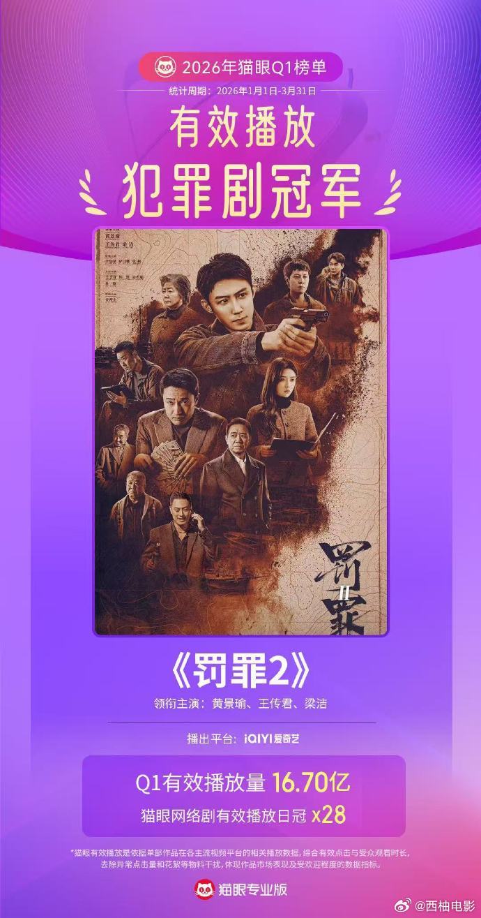 黄景瑜罚罪2夯爆了持续领跑,热度不减。《罚罪2》稳居猫眼Q1犯罪剧冠军,黄景瑜饰演的“秦枫”稳居1月角色热度冠军。长尾效应显著。