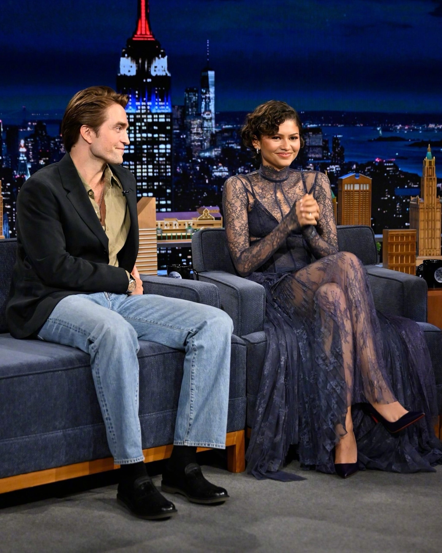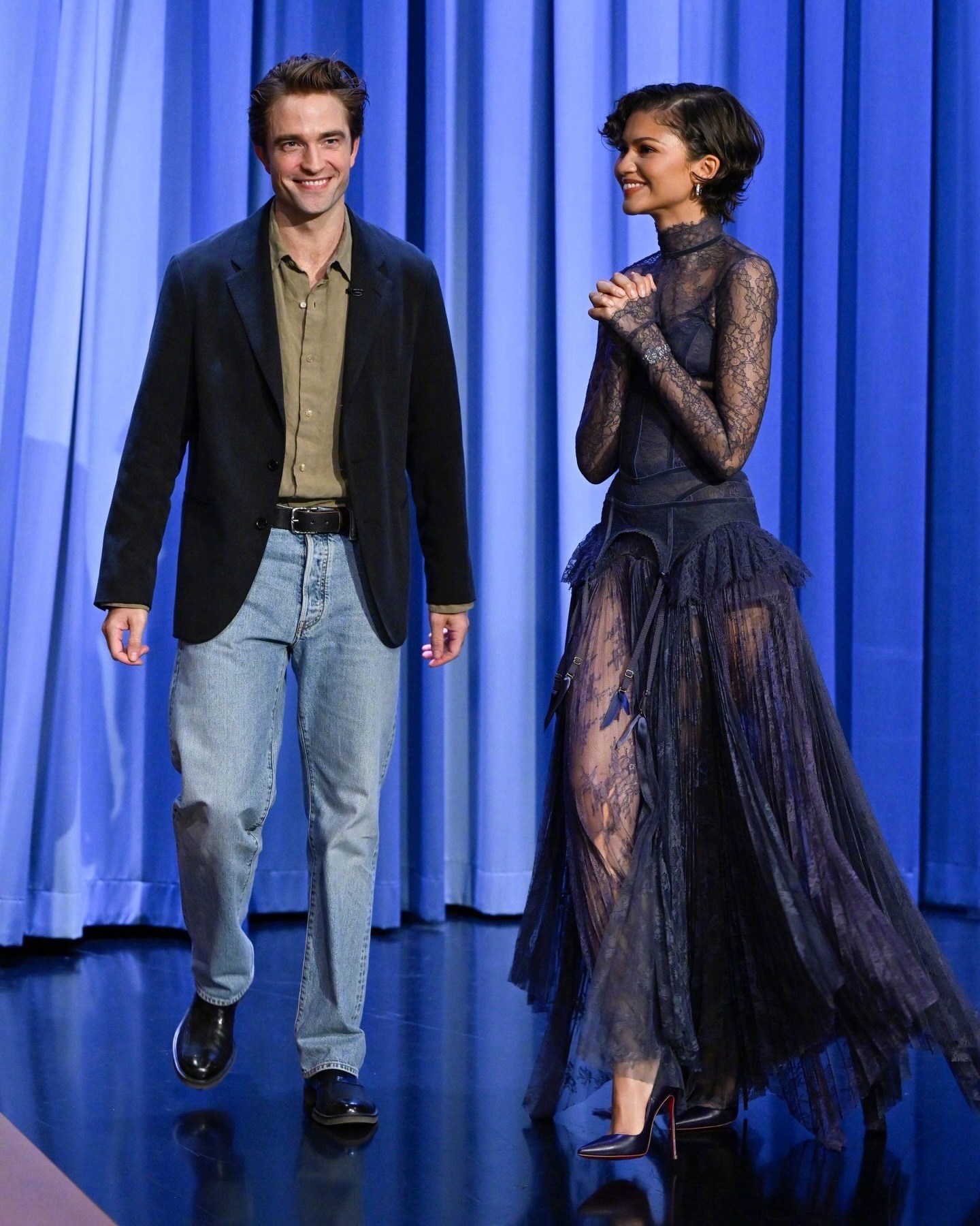 现身纽约参加《今夜秀》(The Tonight Show)录制的赞达亚和Robert Pattinson 继续为新片跑宣传。为呼应电影中的婚礼主题,赞达亚穿上了一件 Zimmermann 的蕾丝连衣裙,把她的“something blue”(婚礼习俗中的“蓝色元素”)巧妙地融入了造型中。米拉服饰解析