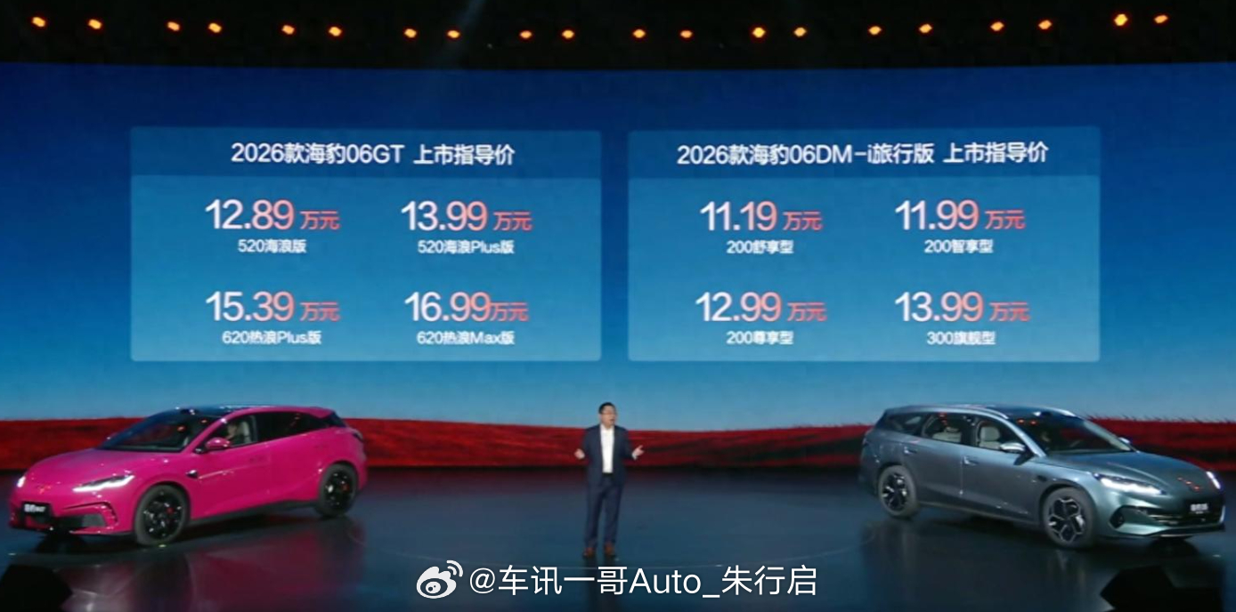 2026款海豹06DM-i旅行版正式上市,11.19万起;2026款海豹06GT同步上市,12.89万起。