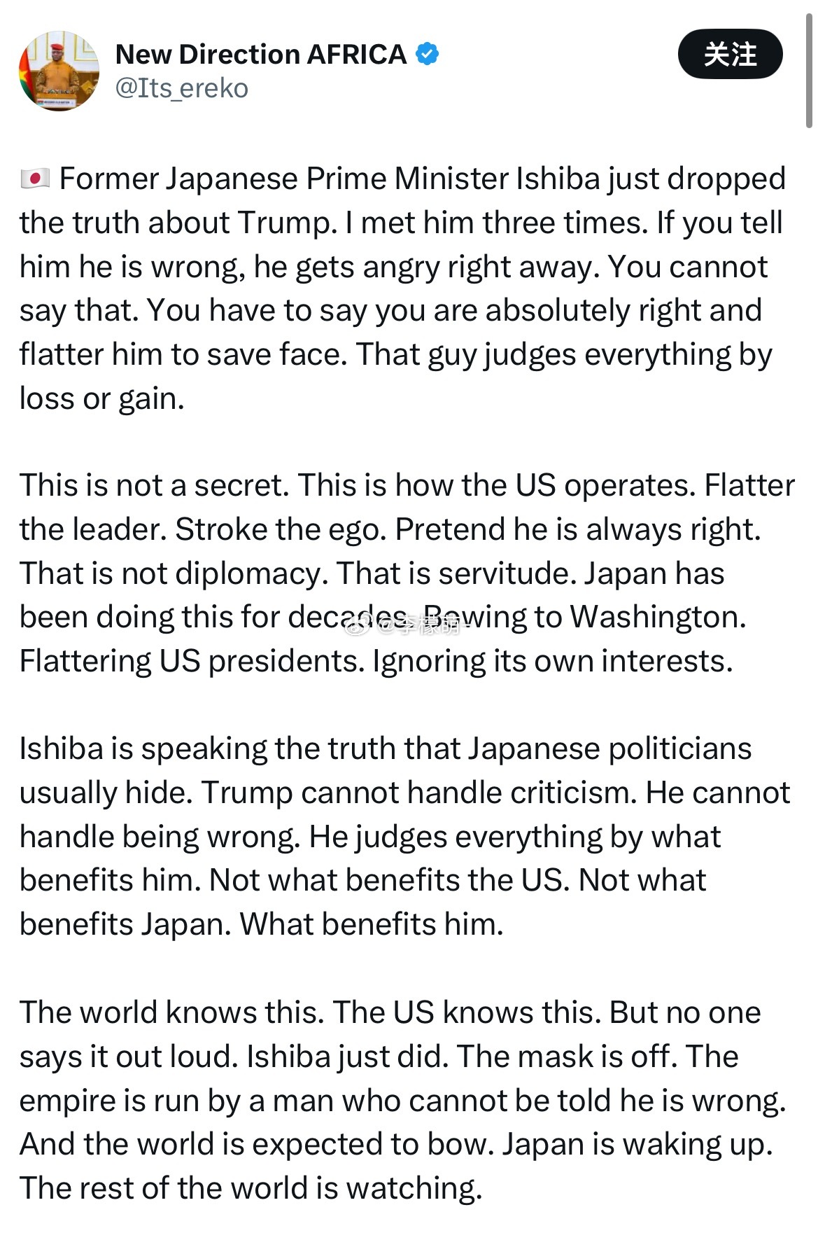 日本前首相石破茂爆猛料:“我见过他(特朗普)三次。如果你告诉他他错了,他会立刻生