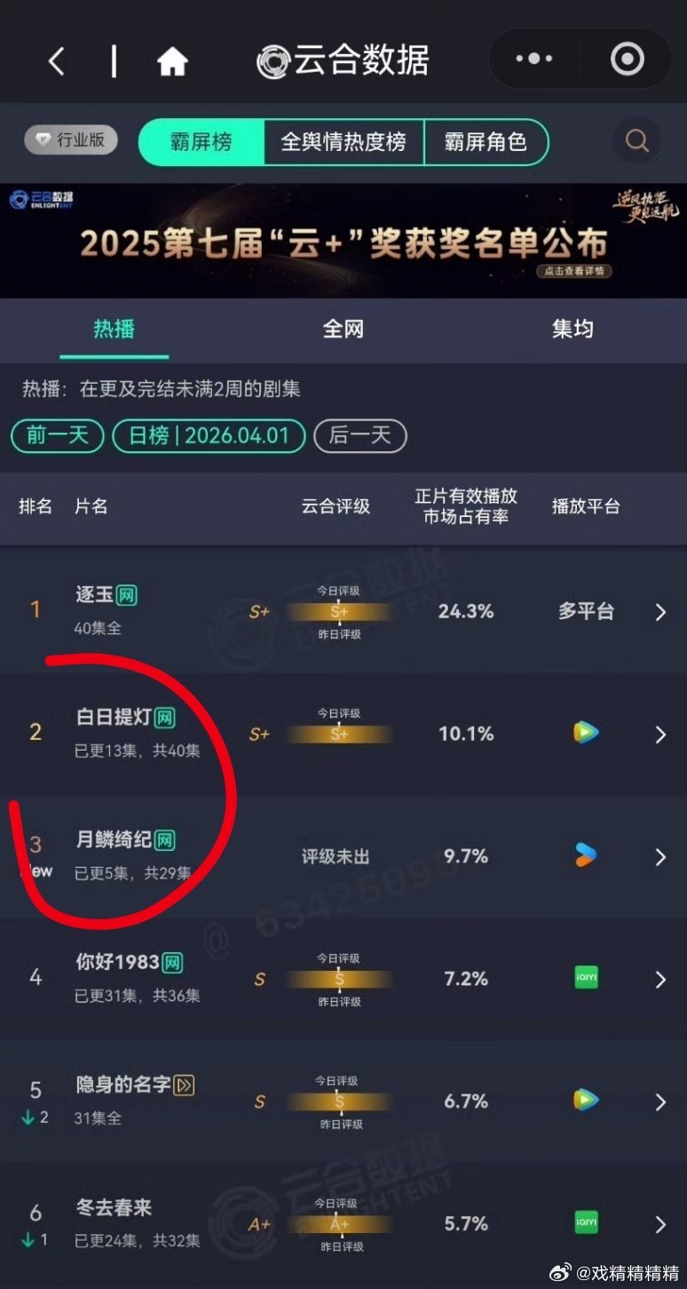 月鳞绮纪云合首日高开9.7%,看来明天就超白日提灯了,这波新剧对打鞠婧祎赢了