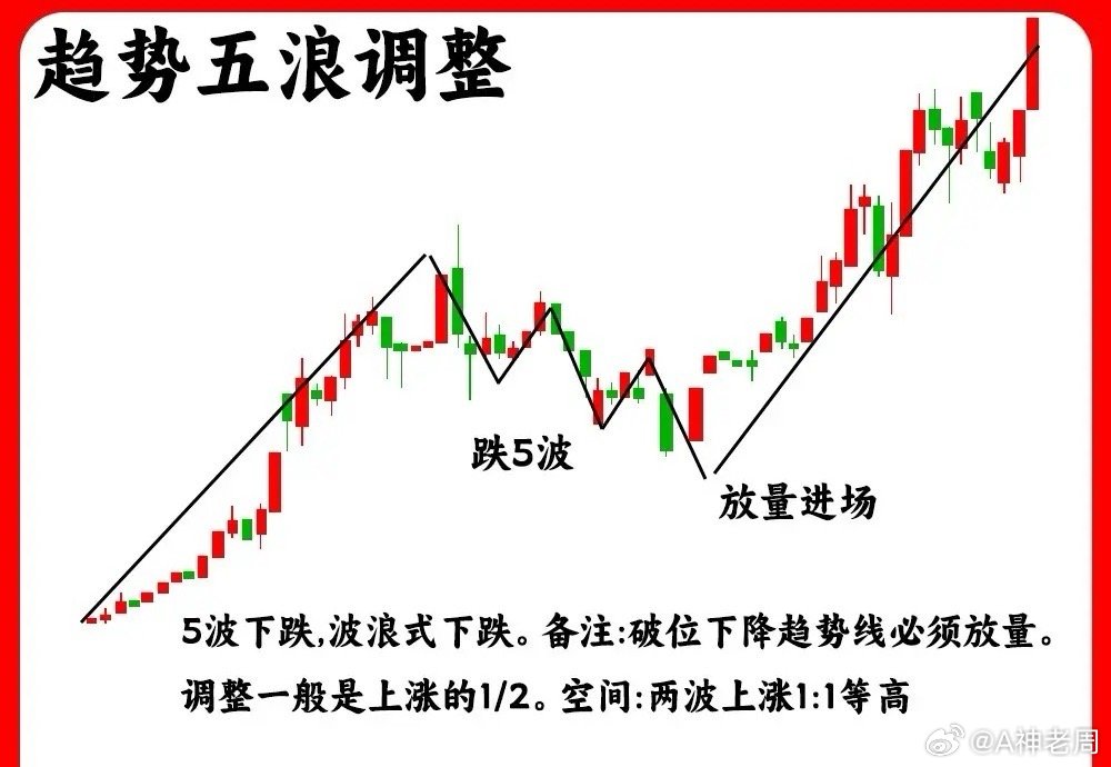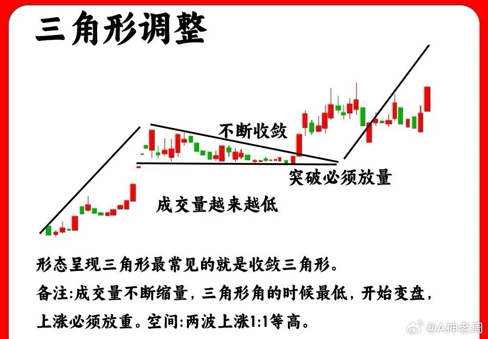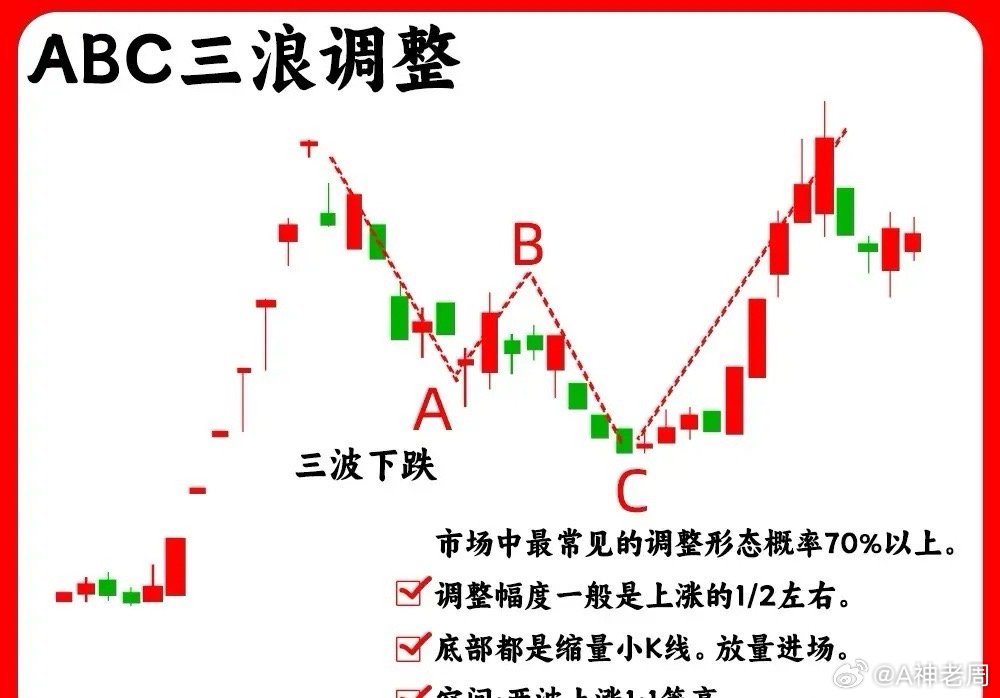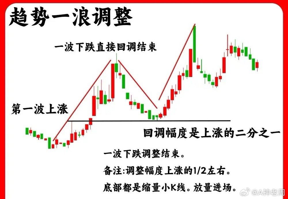 注意了!主力在启动拉升之前或是上涨趋势的中继,往往会出现这六种调整阶段,对于散户来说,波浪理论是最为清楚的,但是这只是一个基础,这六种调整形态才和经典。如果你不打算离开这个市场,那这期内容一定要认真看完还是老规矩,点赞收藏或评论六六六支持一下,我每天分享炒股干货,以免以后想温习找不到了一、ABC 三浪调整这是上涨趋势里的调整浪,由三条浪组合,第一波下跌,速度比较快,而且成交量会放大,这是抛压比较重的表现,,第二波是反弹浪,一般是开始股价上涨的一半一下,不会突破前期的高点,第三波就是继续下跌,成交量缩量,一般都是小阴线小阳线,也就是常说的阴跌二、趋势一浪调整股价一波上涨以后,随后直线下跌,整个调整阶段,并没有出现反弹迹象,调整的时间周期一般会比较短,调整的幅度一般是上涨的一半位置,往往是强势股的主力洗盘三、箱体震荡这种走势,我们就比较常见了,股价在低位或是中继形成一个箱体走势,股价开始横盘,股价到平台上沿,就开始下跌,股价到平台下沿又会出现止跌企稳,所以股价就在这个箱体里,上下震荡,也是主力筑底洗盘的一个过程,等股价突破平台上沿,说明主力洗盘结束四、三角形调整也叫收敛三角形,股价上涨一波以后,开始盘整。股价涨跌幅开始变小,而且高点开始变低,而低点开始变高,就形成一个三角形。成交量出现逐步缩量,代表着分歧开始变小五、趋势五浪调整股价经历一波大幅上涨以后,随后股价开始下跌,进入一个下跌通道,而在下跌过程里,股价下跌,反弹、下跌,经历五次波浪,高点在降低,低点也在降低,第五浪有一个细节,一般会出现缩量,市场抛压变得很弱六、缩量圆弧调整一波上涨以后,股价开始回调,这个周期往往会比较长,股价慢慢回落,随后慢慢回升得到一个过程,就形成一个股价圆弧形态。一般股价回调,会在上涨阶段一半位置,开始止跌企稳,同时会出现地量出现好了!以上就是我们常见的六种调整浪形态。下方我准备了对应的案例图,建议把案例图牢记在心里。希望对大家有启发,也是最为基础的内容,一定吃透。我们下期内容再见短线炒股有什么技巧分享一下股票周期理论市场周期规律股票启动形态股市轮回规律底仓波段策略
