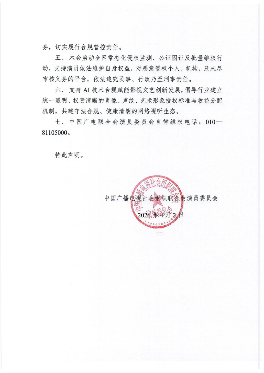 当前,AI换脸合成、声纹克隆复刻、影视素材任意篡改、魔改、擅自抓取演员影像声频用于AI模型训练等侵权行为频发,严重侵害演艺从业人员合法权益,扰乱视听行业正常秩序。为规范行业发展、严守法律底线、强化权益保护,中国广播电视社会组织联合会演员委员会发布严正声明。