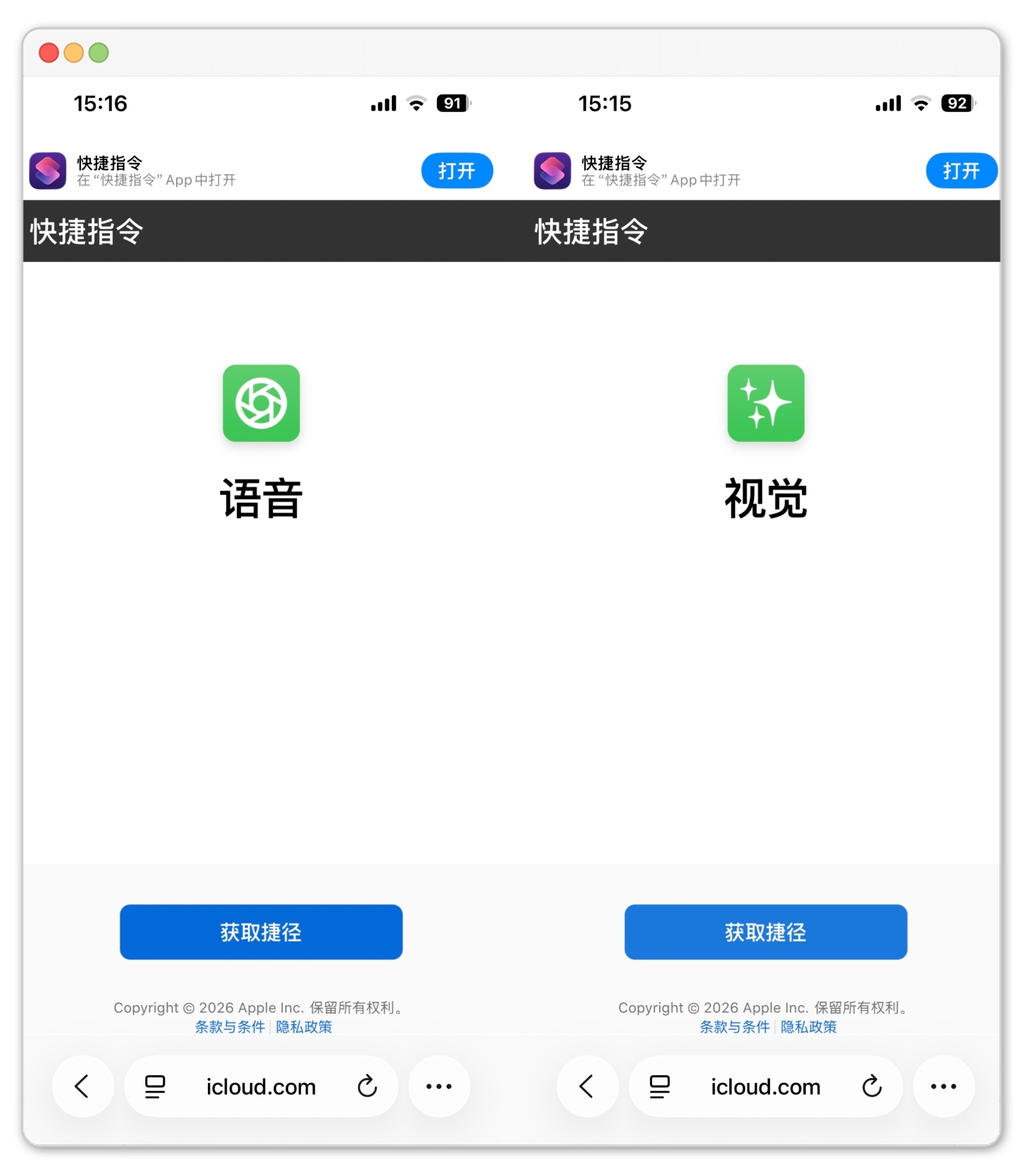 详细步骤第一步:安装快捷指令使用Safari浏览器安装两个核心指令:视觉指令(支持拍照/图片识别)语音指令(支持Siri语音对话)