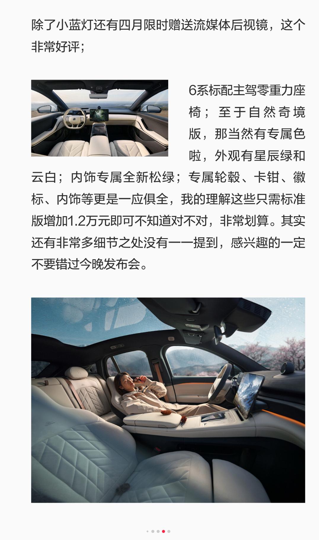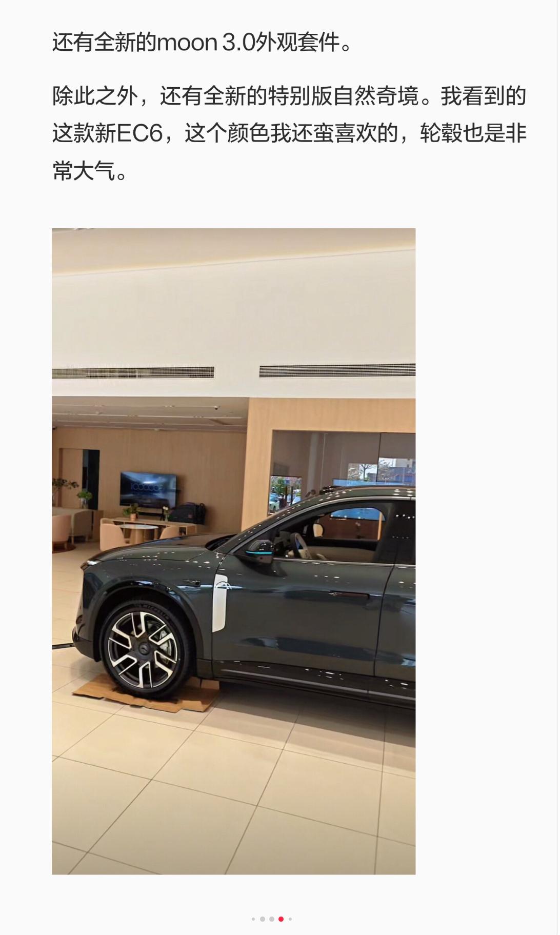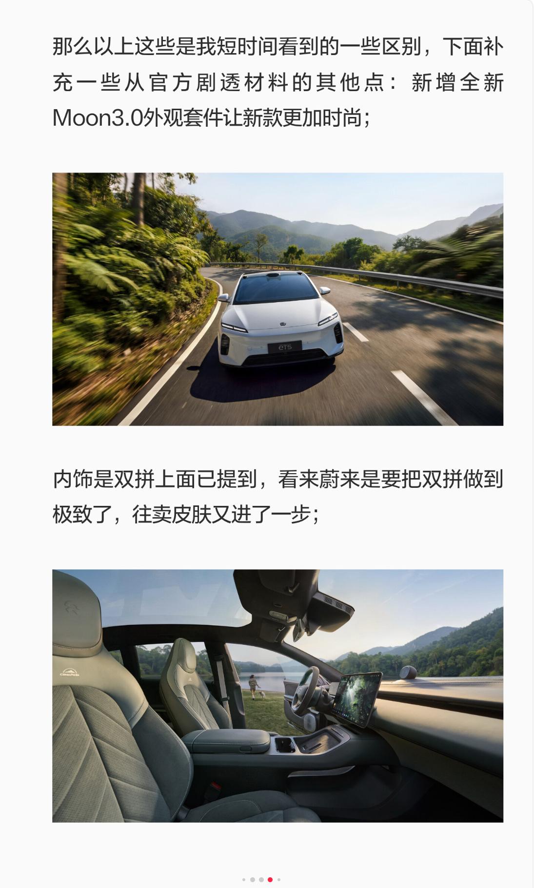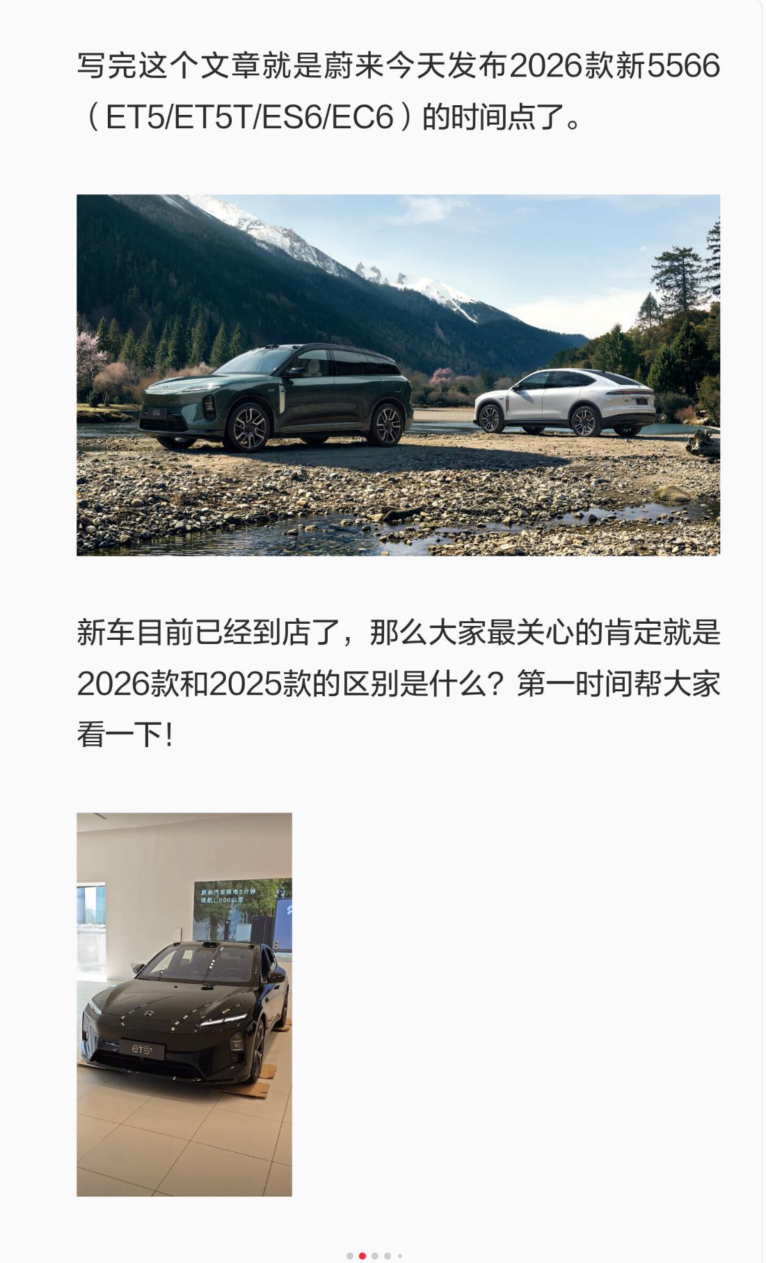 门店实录+官方剧透:一文帮你摸清楚蔚来2026款5566更新细节 写完这个文章就是蔚来今天发布2026款新5566(ET5/ET5T/ES6/EC6)的时间点了。 新车目前已经到店了,那么大家最关心的肯定就是2026款和2025款的区别是什么?第一时间帮大家看一下! 目前我了解到的主要区别包括新增标配辅助驾驶指示灯也就是小蓝灯。 另外原来选配的舒享套装也成为标配,属于蔚来典型的增配不增价。 还有全新的moon 3.0外观套件。 除此之外,还有全新的特别版自然奇境。我看到的这款新EC6,这个颜色我还蛮喜欢的,轮毂也是非常大气。 其次,这次的内饰有一些变动,类似冠军版那样做了不少细节,标配了nappa和haptax双拼套装,不知道大家喜不喜欢。 那么以上这些是我短时间看到的一些区别,下面补充一些从官方剧透材料的其他点:新增全新Moon3.0外观套件让新款更加时尚;内饰是双拼上面已提到,看来蔚来是要把双拼做到极致了,往卖皮肤又进了一步;除了小蓝灯还有四月限时赠送流媒体后视镜,这个非常好评;6系标配主驾零重力座椅;至于自然奇境版,那当然有专属色啦,外观有星辰绿和云白;内饰专属全新松绿;专属轮毂、卡钳、徽标、内饰等更是一应俱全,我的理解这些只需标准版增加1.2万元即可不知道对不对,非常划算。其实还有非常多细节之处没有一一提到,感兴趣的一定不要错过今晚发布会。 最后是价格,这里不便多说,简单提一下:5系整车买断不到30,租电直接19起飞;6系整车33.8起,租电23个,EC6比ES6高2个(单位万)。还有其他各种锁单优惠可咨询蔚来门店。蔚来 蔚来ES6 蔚来ET5