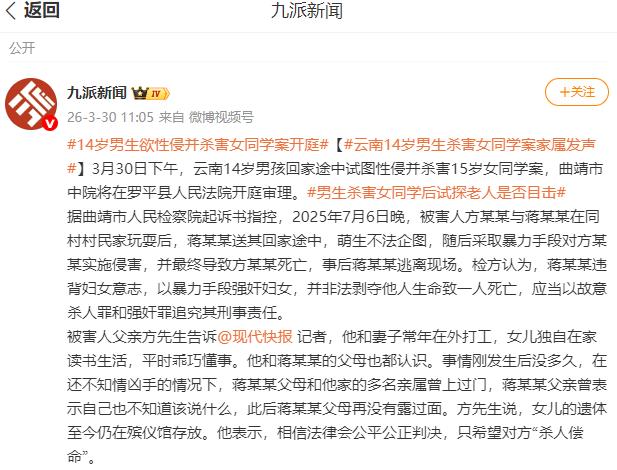 云南曲靖,一14岁少年在与女同学一起玩耍时,趁对方不备,将其抱住后欲发生关系。女同学激烈反抗、大声呼救后,少年担心自己的行为暴露,竟将女同学残忍杀害后抛尸路边。后警方对少年进行审讯时,少年始终未承认是自己杀了女同学,之后到了法庭上,少年的认罪态度极差,直到庭审快结束时,才向女同学父母道歉,还提出要赡养二人,但遭到了拒绝。女同学父母明确表示放弃一切赔偿,只要求严惩。 2025 年 7 月 6 日晚上,14 岁的蒋某某和 15 岁的女同学方某某,在同村村民家玩耍结束后,蒋某某主动提出送方某某回家。 原本是同龄人之间正常的结伴同行,谁也没想到,蒋某某在途中突然心生龌龊想法,想要对方某某实施奸淫。他趁着夜色和周边无人的环境,突然对方某某动手,试图强行侵犯对方。 面对蒋某某的不法侵害,方某某没有丝毫妥协,她激烈反抗,同时大声呼救,想要挣脱控制,也希望能引来附近村民的帮助。 可方某某的反抗和呼救,不仅没有让蒋某某停下恶行,反而让他变得更加疯狂。蒋某某担心自己的罪行被人发现,为了掩盖丑事,他竟然狠下杀手,用双手死死扼住方某某的颈部,最终导致方某某机械性窒息死亡。 作案之后,蒋某某没有丝毫愧疚,为了逃避责任,他将方某某的尸体抛在路边,随后悄悄逃离现场。 一个鲜活的花季生命,就这样被昔日的同伴残忍夺走,女孩的家人一夜之间陷入巨大的悲痛,而蒋某某的所作所为,早已突破了人性的底线,违背了最基本的道德与法律准则,性质极其恶劣。 审讯拒不认,庭审态度劣 案件发生后,当地村民发现方某某失联并报警,警方迅速展开侦查,通过现场勘查、线索排查以及村民提供的信息,很快锁定了有重大作案嫌疑的蒋某某。2025 年 7 月 7 日中午,警方在蒋某某的家中将其抓获归案。 面对警方的审讯,蒋某某全程拒不承认自己的犯罪事实,对性侵、杀人、抛尸的关键情节百般抵赖,前两次讯问都没有如实供述,始终试图隐瞒真相、逃避法律的制裁。 他的态度冷漠又顽固,丝毫没有意识到自己的行为给方某某的家人带来了多大的伤害,也没有对逝去的生命有半点敬畏。 2026 年 3 月 30 日下午,曲靖市中级人民法院在罗平县人民法院对这起案件进行一审审理,因为涉及未成年人隐私,案件依法不公开审理。 庭审从下午两点一直持续到傍晚六点,整个过程中,蒋某某的认罪态度依旧极其恶劣,全程神情冷漠,像没事人一样,对指控的罪行避重就轻,没有主动交代犯罪细节,也没有主动向方某某的父母道歉。 直到庭审快要结束,进入最后陈述环节时,蒋某某才勉强开口向方某某的父母道歉,甚至还提出自己出狱后要赡养两位老人,想用这种看似悔过的方式博取谅解,减轻自己的刑罚。 可这样迟来的、毫无诚意的道歉,根本无法抚平丧女之痛,方某某的父母当场断然拒绝,他们清楚,这份道歉不是真心悔过,只是少年为了自保的权宜之计。 在庭审现场,方某某的父母做出了让所有人动容的选择:他们当庭明确表示,自愿放弃全部刑事附带民事赔偿,不索要任何经济补偿,唯一的诉求就是要求法院依法严惩蒋某某,为逝去的女儿讨回公道。 对于两位老人来说,女儿是心头肉,是无法用金钱衡量的珍宝,再多的赔偿也换不回女儿的生命,也抹不平心里的伤痛。 他们想要的从来不是物质补偿,而是法律的正义,是让作恶者为自己的残忍行为承担应有的责任,告慰女儿的在天之灵。 目前,法院经过审理后没有当庭宣判,将结合案件事实、证据以及相关法律规定,择日作出最终判决。 这起案件牵动着全社会的心,大家都在静待法律的公正裁决。一方面,要给逝去的方某某一个交代,让花季生命的陨落能换来正义的回响;另一方面,要给悲痛欲绝的受害人家属一个慰藉,让他们感受到法律的威严与温度。 更重要的是,这起案件也给所有未成年人、家长和学校敲响了警钟:未成年绝不是暴力犯罪的 “挡箭牌”,法律的底线不容践踏,生命的尊严不容侵犯,只有从小树立法治观念、敬畏生命、尊重他人,才能避免类似的悲剧再次上演。