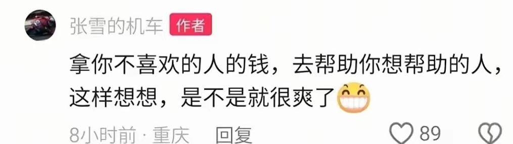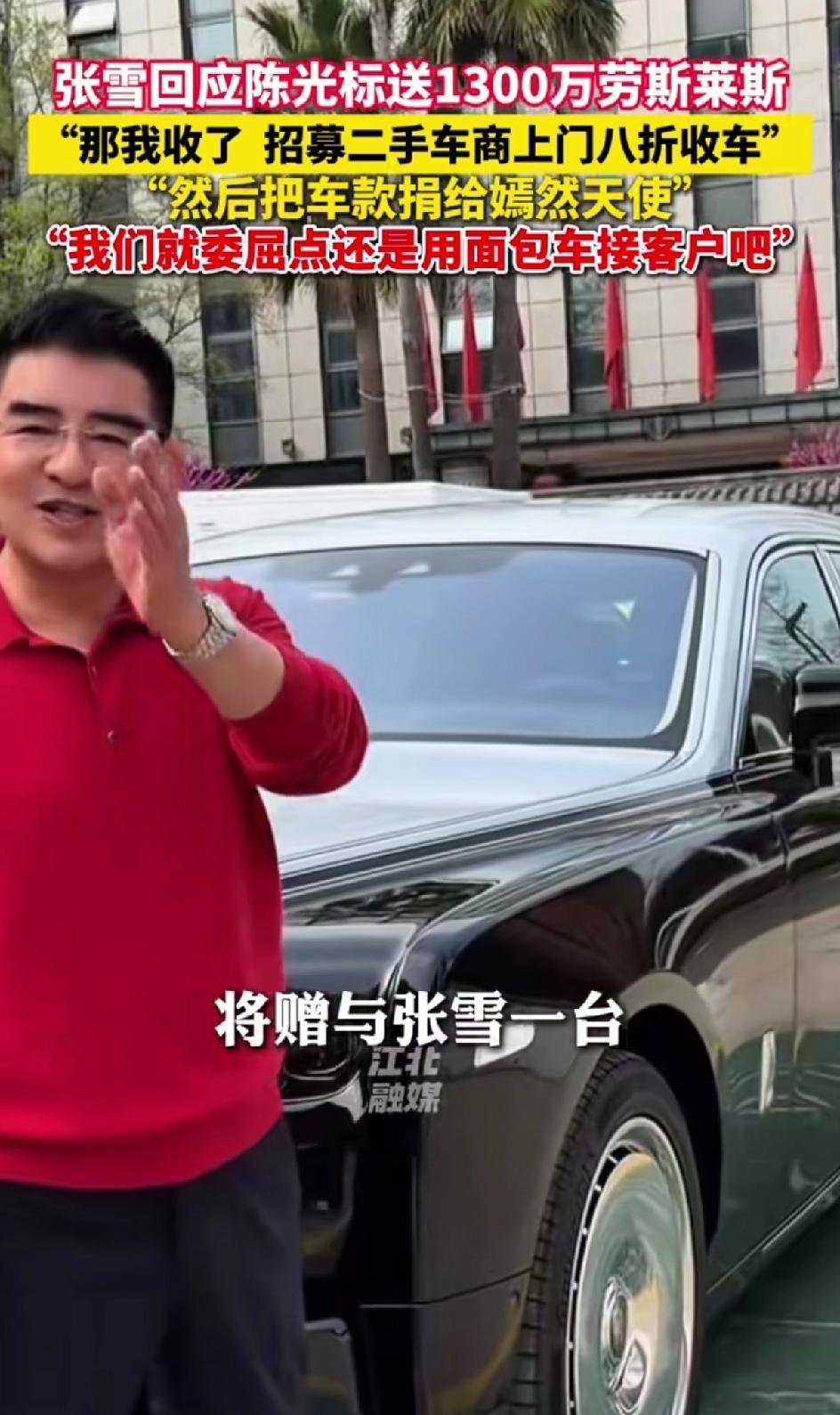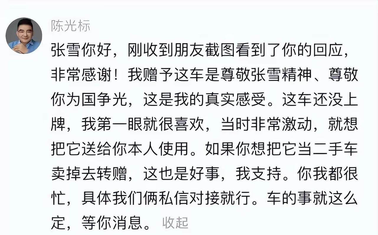 高手过招啊!看的真热闹。陈光标说送,张雪说可以,我收。收完了之后捐出去陈光标说你误会我的意思,这样让我很伤心。过了一会又修改了一下自己的评论,说,你要真的想捐的话,那也是好事,我支持。王雪说。拿着他的钱去帮应该帮助的人就很爽了。有人说他这个车不会过户的,只是给你使用。陈光标昨天明说了:车还没上牌,赠与你个人使用。使用,所有权还在陈光标这里。大概率张雪是不会使用的,陈光标一片好心,付于东流水。