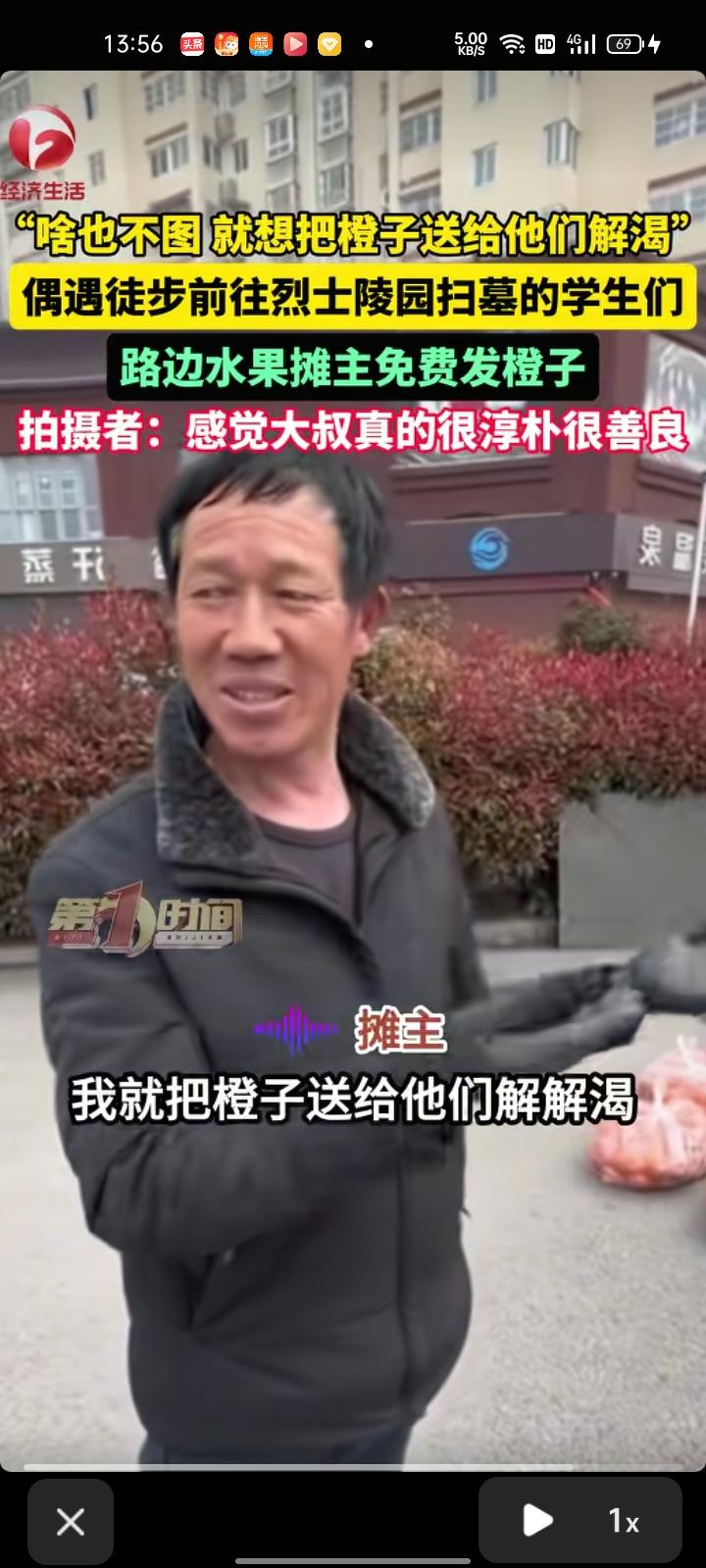 3月31日,宿迁市沭阳县。网友发视频称,自己看到小朋友们去烈士陵园扫墓,水果摊摊主拿着橙子投喂他们。这个摊主一直笑眯眯的,送出去好几袋,估计有五六十斤,摊主说单纯想让学生们解解渴,感觉他真的很善良很纯朴 宿迁身边事扫墓