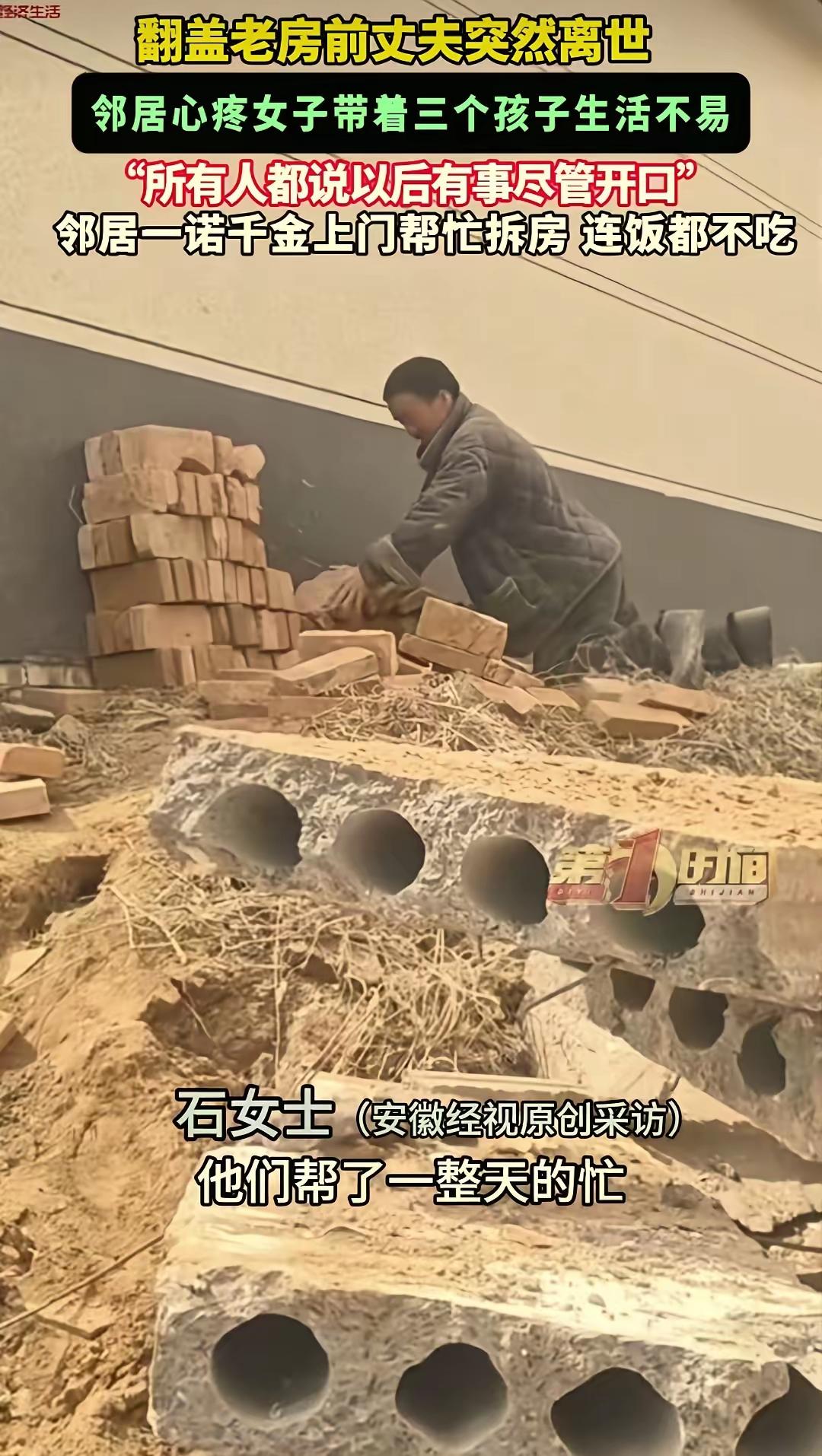 河南开封,石女士和丈夫商量好了,去年11月把老房子拆掉,原地盖新房,东西都备好了,就等着开工。 拆房子前一天,丈夫突发脑出血,两天后走了。 石女士把丈夫安葬完,带着三个孩子住在那个还没拆的老房子里。丈夫生前最大的心愿就是翻盖新房,让一家人住得好一点。她想,再难也要把这房子盖完,为了丈夫,也为了三个孩子。 她找村里一户人家借住,头天晚上提的,第二天早上邻居就把屋子收拾好了,催她赶紧搬进去,说别嫌房子旧。 正式拆房那天,恰好被几个村民看见,简单问了两句情况,就在原地帮着动手了。没多久,来的人越来越多,她自己一个人都没去通知,人就来了。有大姨,有年轻小伙,有中年人,还有上了年纪的老人,有人自带工具,有人直接坐在砖头堆里挑砖头。 到了中午,所有人自己回家去吃饭,没人让石女士张罗,下午又结伴回来继续干。 石女士站在旁边,眼眶红了,又觉得自己招待不周,一个劲道谢。村民说,以后家里有事你就开口。 她哽咽了半天,说不出话,后来才说:谢谢你们,我的好邻居们。 丈夫刚走,孤儿寡母要盖房子,一个人张罗三个孩子加上这么多事,换谁都觉得撑不住。这些邻居没人召集,没人组织,就自己来了,干完活中午回家吃饭,怕给她添麻烦。 这种事不用说什么大道理,看见了就觉得,人心还是好的。