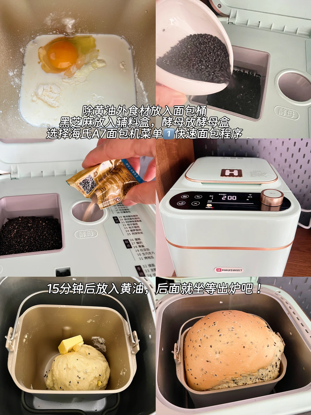 1️⃣除黄油外食材放入面包桶,黑芝麻放入辅料盒,酵母放酵母盒、选择海氏A7面包机菜单1️⃣快速面包,选择浅色,自动辅料