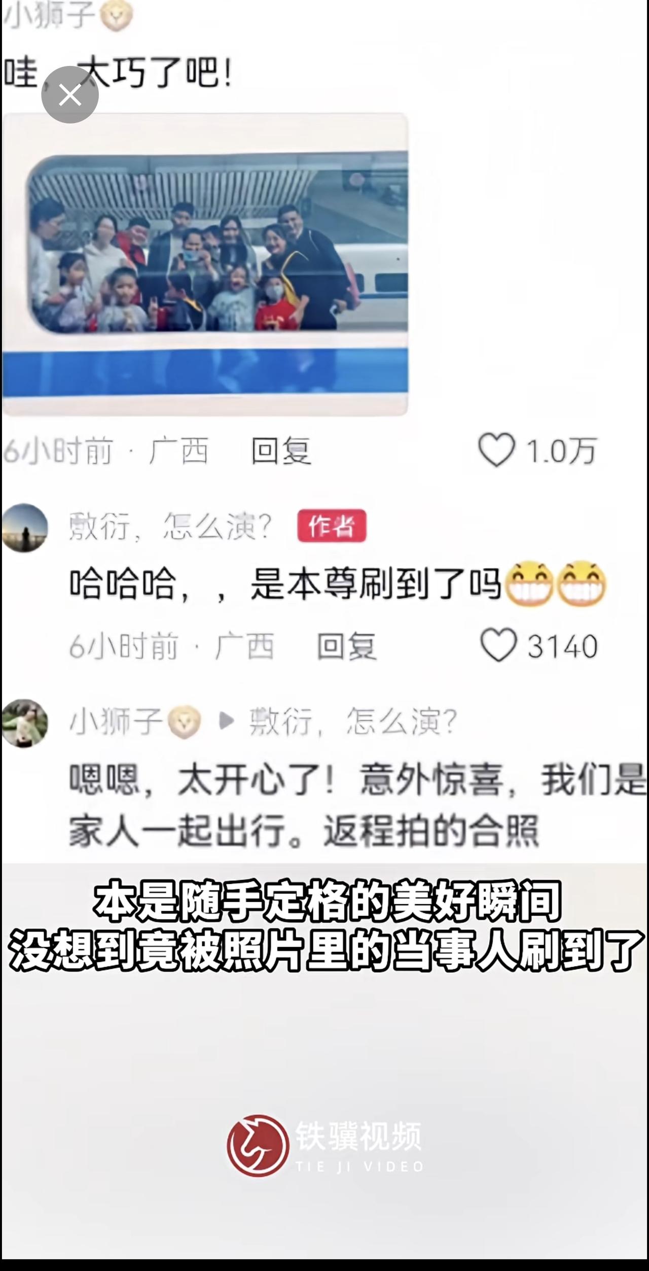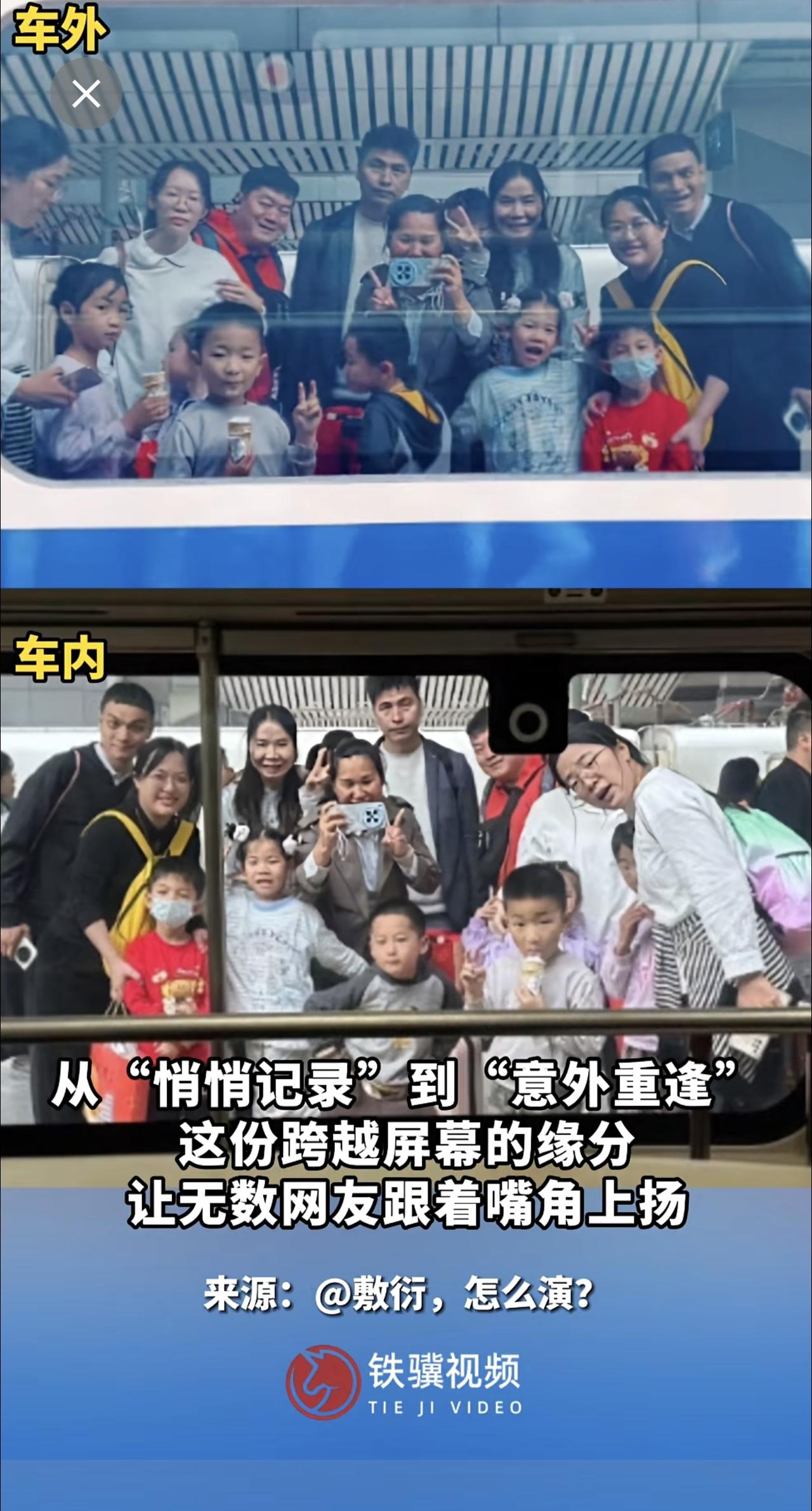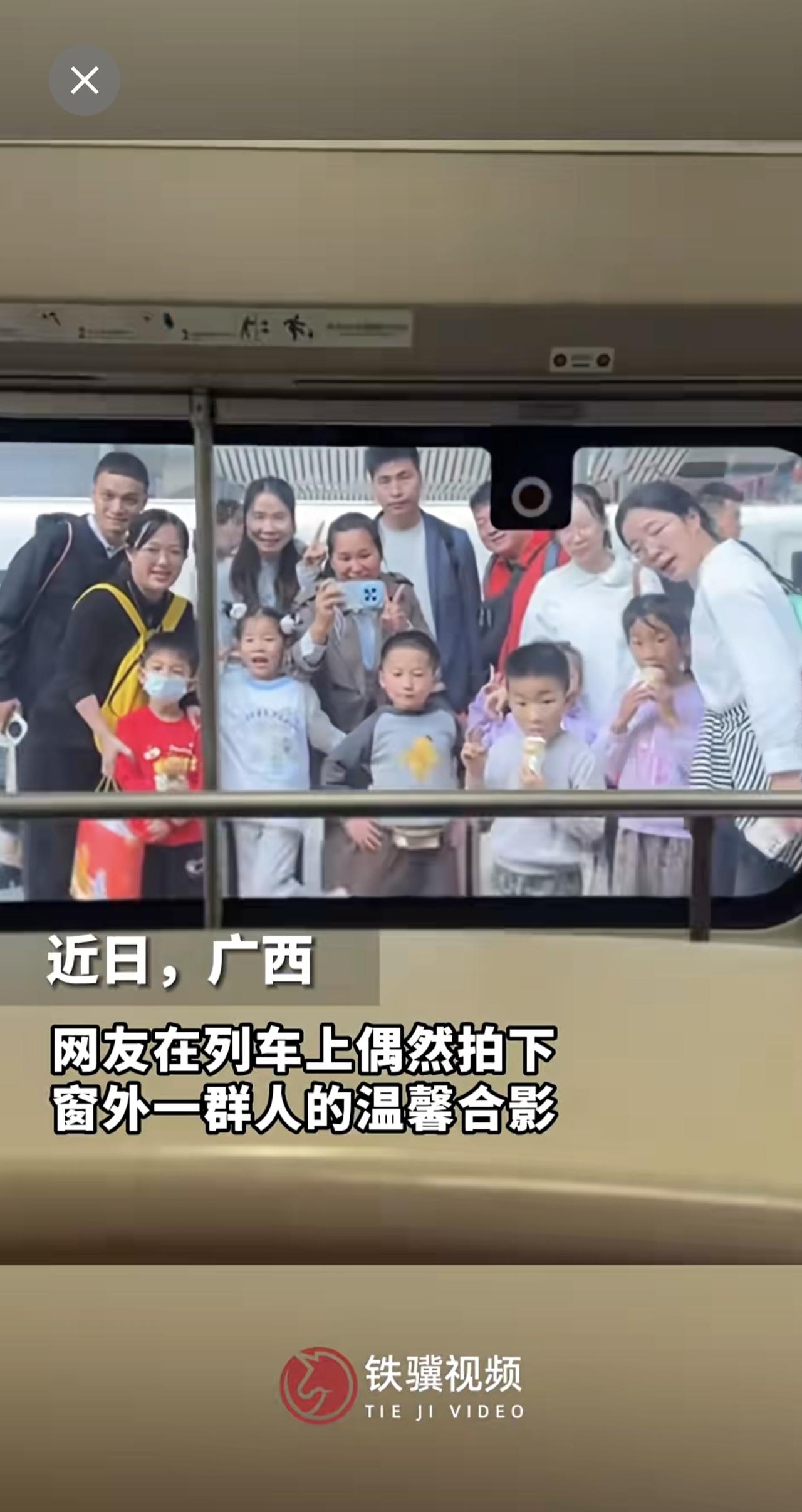 网友在列车上偶然拍下窗外一群人的温馨合影,竟被当事人刷到了!
