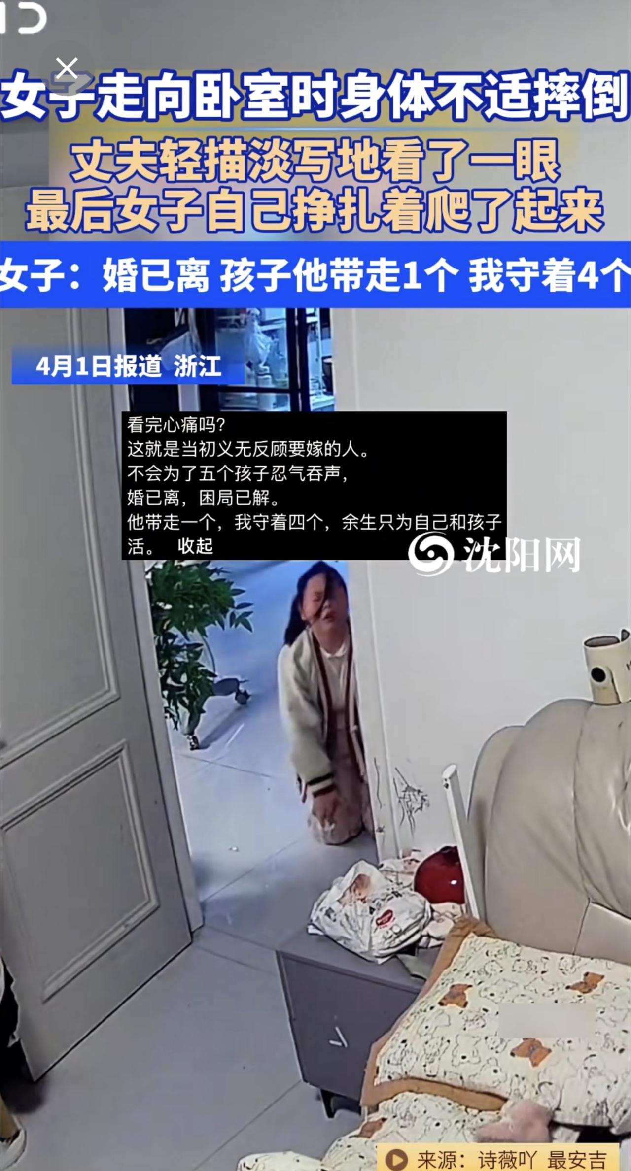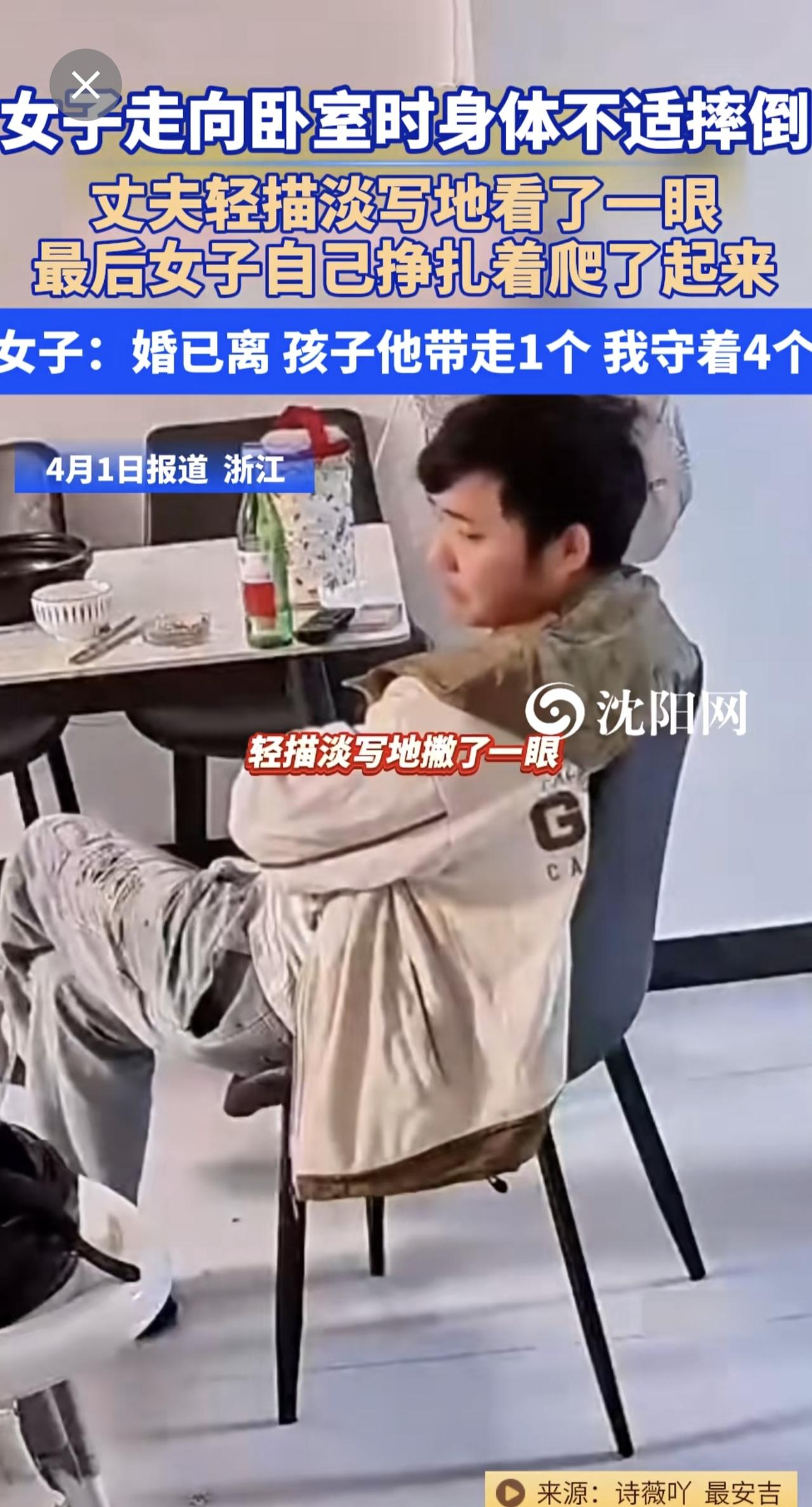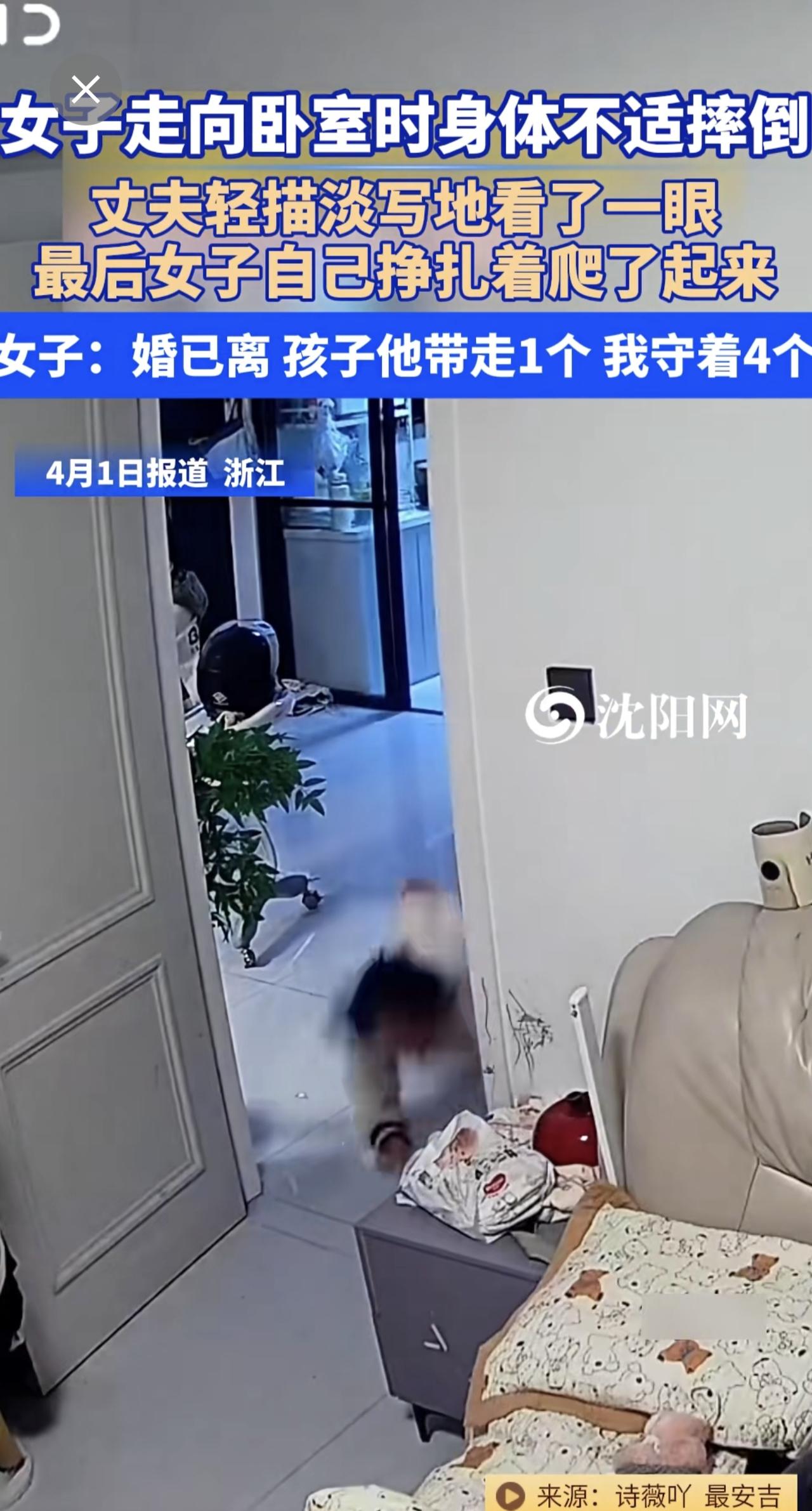 4月1日(报道),浙江 。女子走向卧室时身体不适摔倒,丈夫轻描淡写地看了一眼,最后女子自己挣扎着爬了起来。女子:婚已离,孩子他带走1个,我守着4个@诗薇是辣妈 (编辑:于璐)
