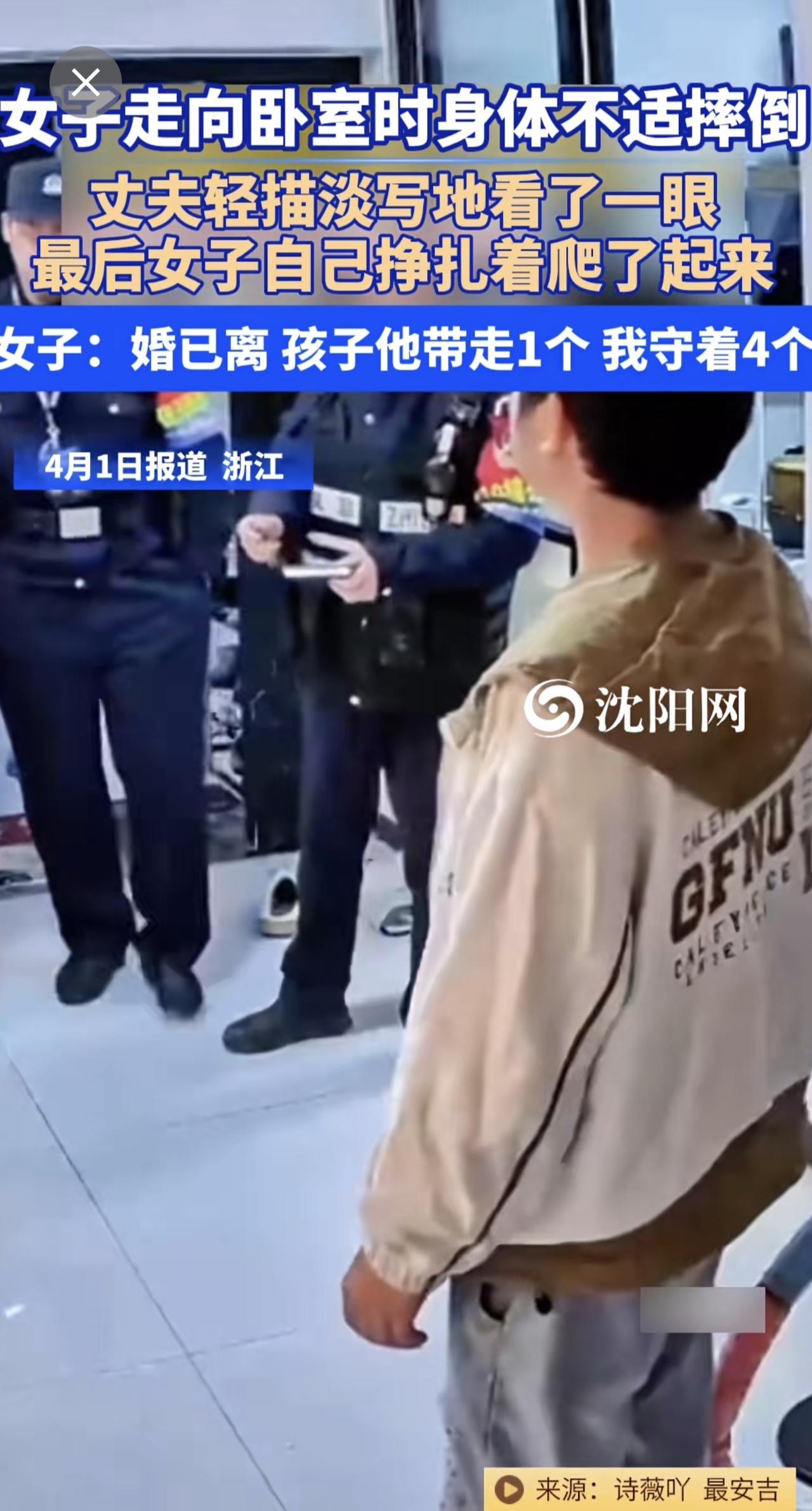 4月1日(报道),浙江 。女子走向卧室时身体不适摔倒,丈夫轻描淡写地看了一眼,最
