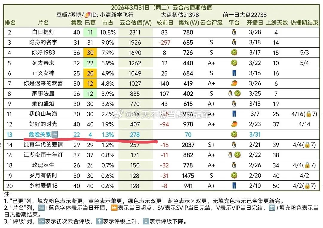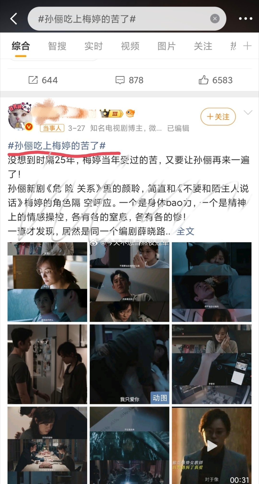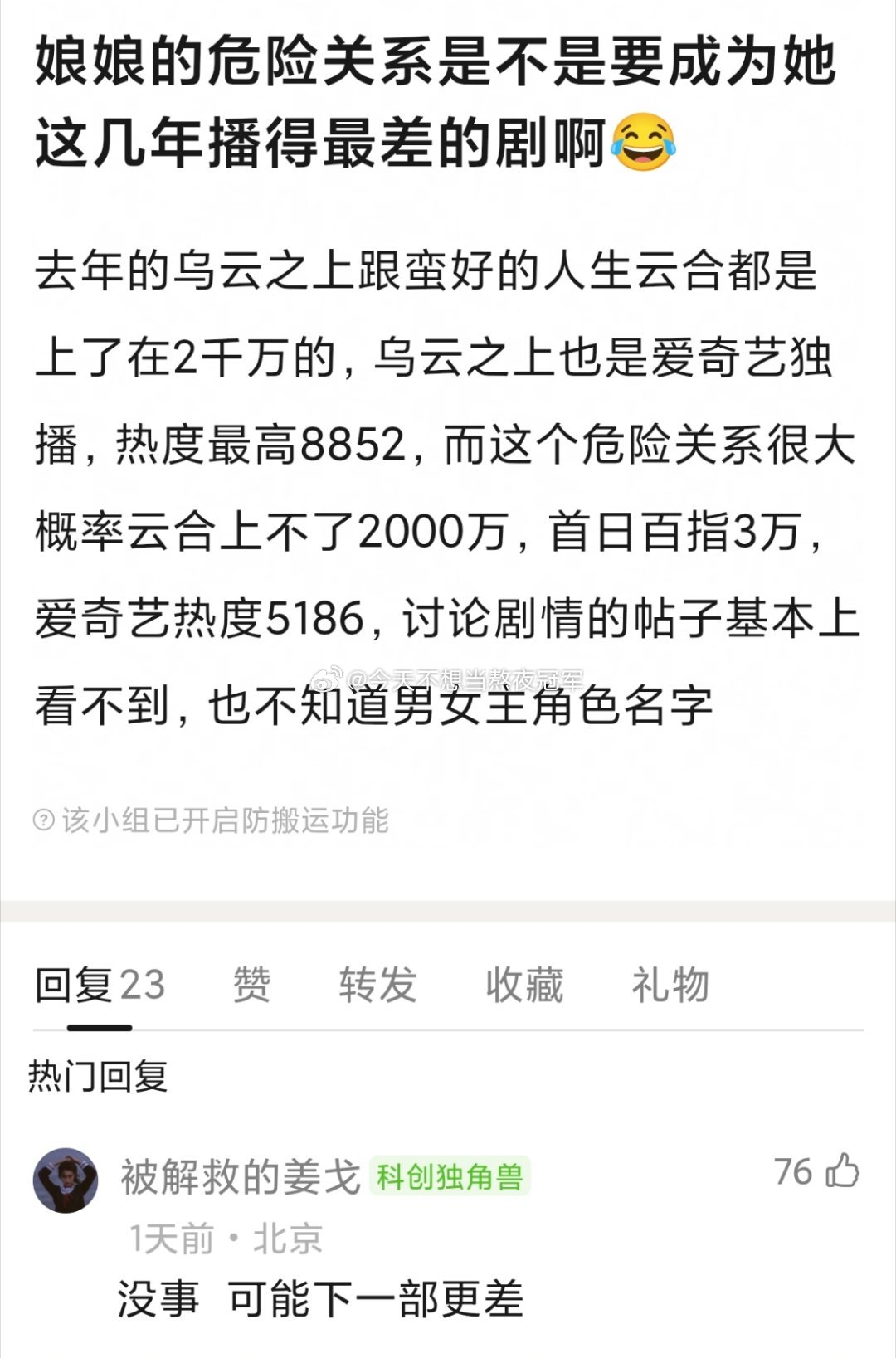 大虐,孙俪新剧《危险关系》这个开播热度不太妙啊。。。宣发对 标梅婷的《不要和陌生人说话》,结果首日云合1.3%,播放量200w,首日低开➕次日坠✈️,丝毫看不到路人进场的迹象就连蒋欣和《甄嬛传》姐妹团出来打call都不好使。。。