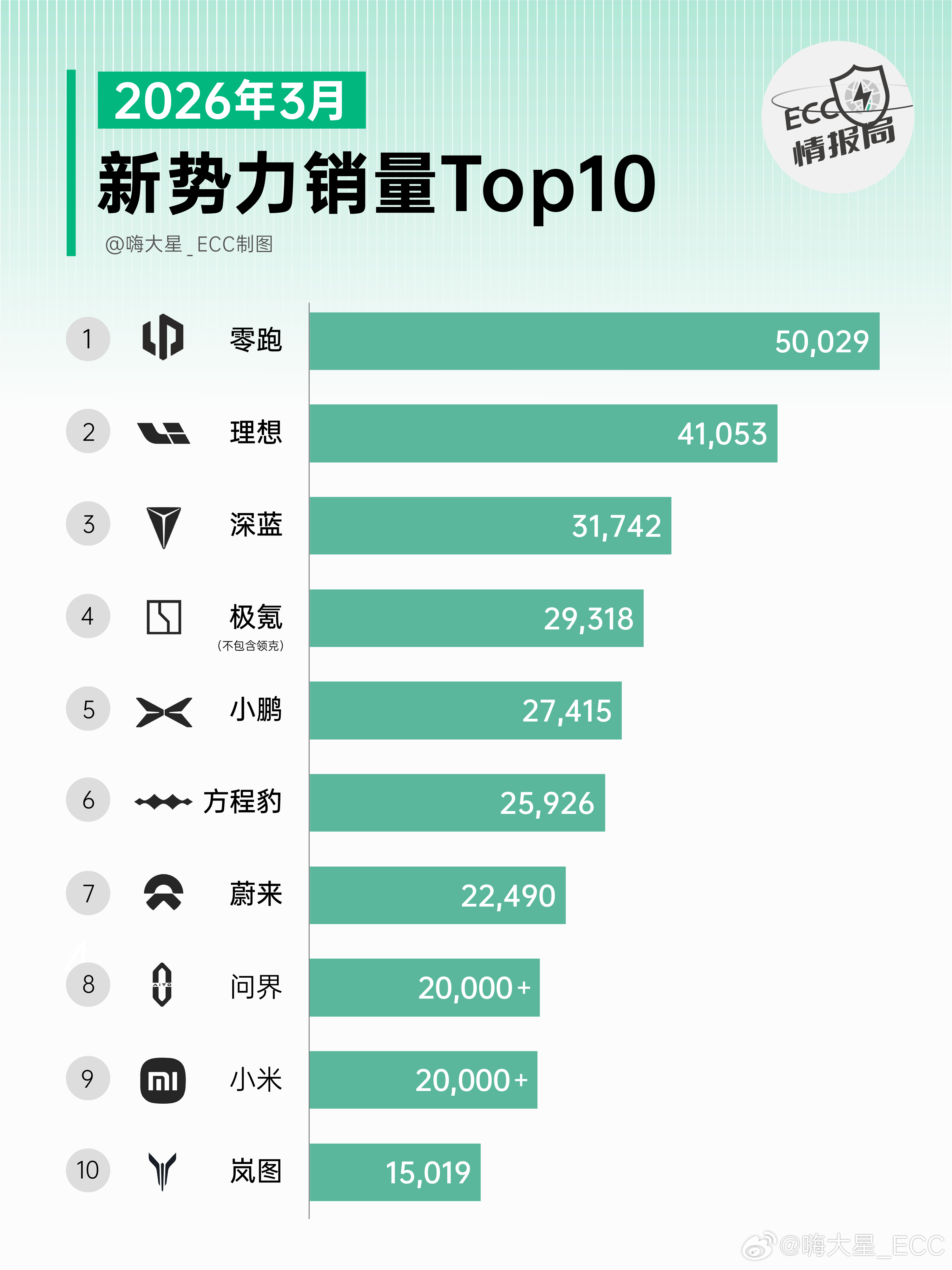 - 零跑 50,029台- 理想 41,053台- 深蓝 31,742台