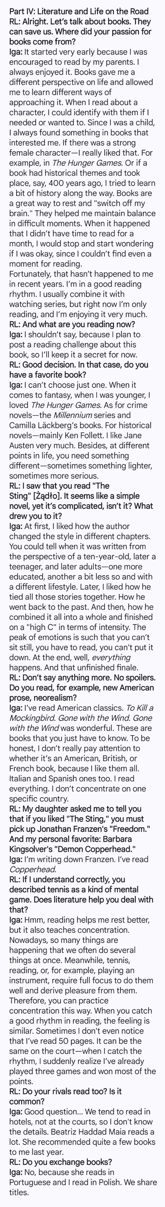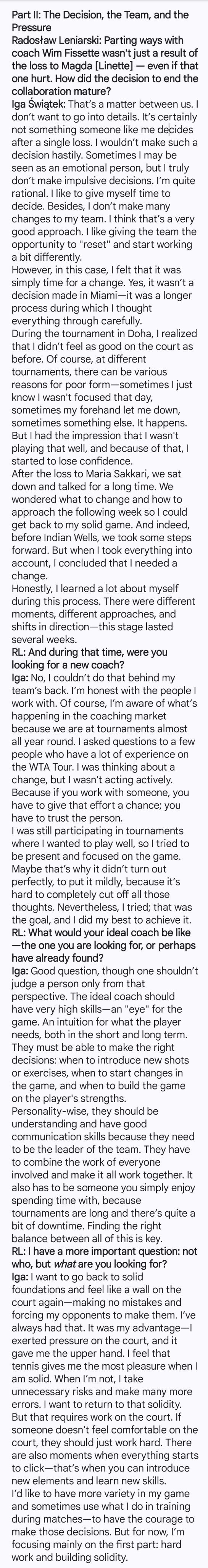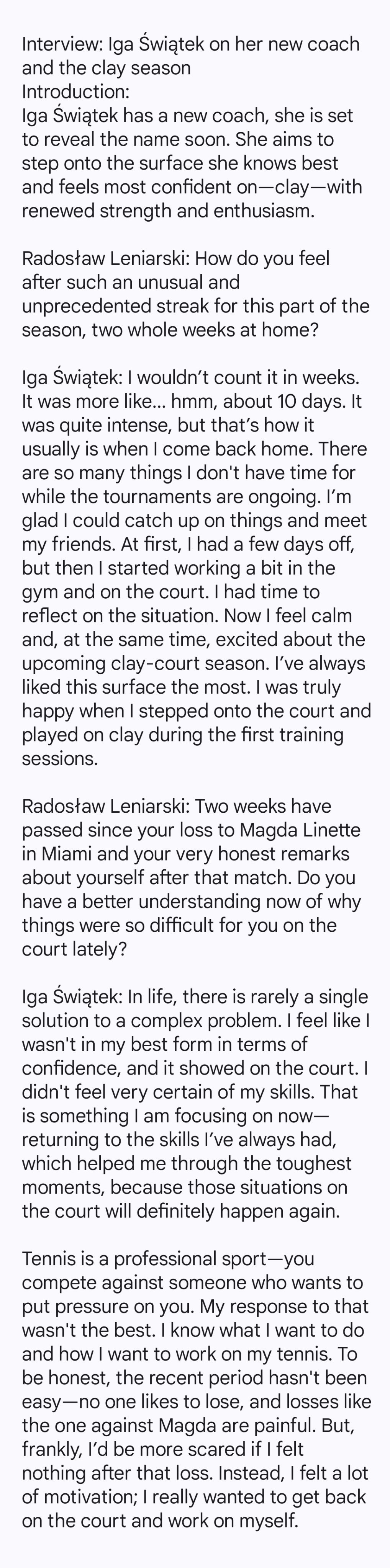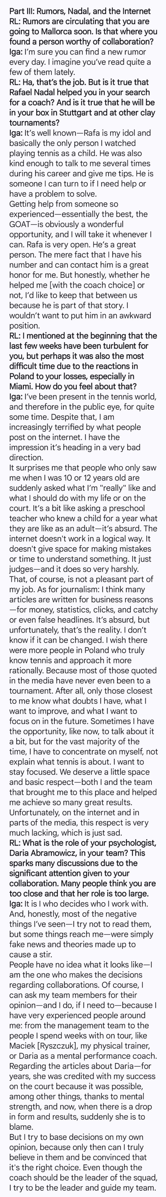 * 最长的段落,针对之前她的启蒙教练与很多波兰记者把矛头对准心理辅导师达利亚·阿布拉莫维茨的评论(网页链接),斯瓦泰克给予了强力回击:我越来越害怕人们在互联网发表的内容,我感觉这正朝着非常糟糕的方向发展。令我惊讶的是,那些在我 10 岁、 12 岁时接触过我的人,突然被问起了我现在“真实”的样子,我应该如何规划人生,又或者该在球场上如何表现。这有点像问一位只与某个孩子相处了一年的小学老师,他们长大后会是什么样子,简直荒谬至极!网络思维没有逻辑,没有容错空间,也没有给人们足够的时间去理解某些事情。它只进行评判,而且评判得非常严厉,这当然是我这份工作不愉快的部分。至于记者:我认为很多文章都出于商业目的——为了赚钱、为了数据、为了点击量,为了吸引眼球甚至去编造标题。这很荒谬,但不幸这就是现实。我不知道这能否改变。我希望波兰能有更多真正懂网球并能理性地看待它的人,因为那些被媒体采访的人中有很多甚至从未参加过职业比赛。只有与我关系最亲密的人才知道我有哪些疑虑,想要改进什么,应该关注什么。有时,我会有机会像现在这样稍稍谈起这件事,但大多数时候我必须专注于自己,而不是去解释网球到底是怎么回事。我想保持专注,我们应该得到一点空间和起码的尊重,包括帮我取得诸多出色成绩的团队成员。不幸的是,网络和某些媒体明显缺少这种尊重,这实在令人悲哀。