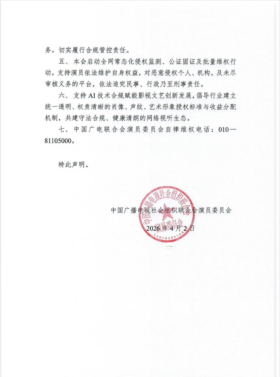 中国广电联合会演员委员会就当前AI换脸合成、声纹克隆复刻、影视素材任意篡改等侵权行为发布严正声明:1、未经演员本人授权,严禁擅自采集合成其容貌、声音等。2、使用AI换脸或撞脸公众演员需承担全部侵权责任。3、网络平台需从严管控AI生成内容。中国广电联合会演员委员会针对AI侵权发布声明