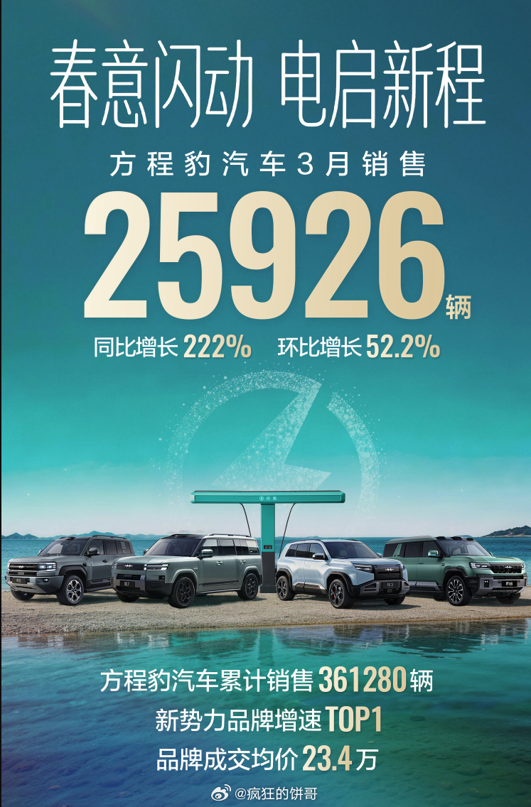 王朝网:3月118317辆海洋网:3月140169辆方程豹:3月25926辆,双增长,同比+222%,环比+52.2%,亮点是成交均价23万多。腾势:3月7133辆仰望:3月307辆