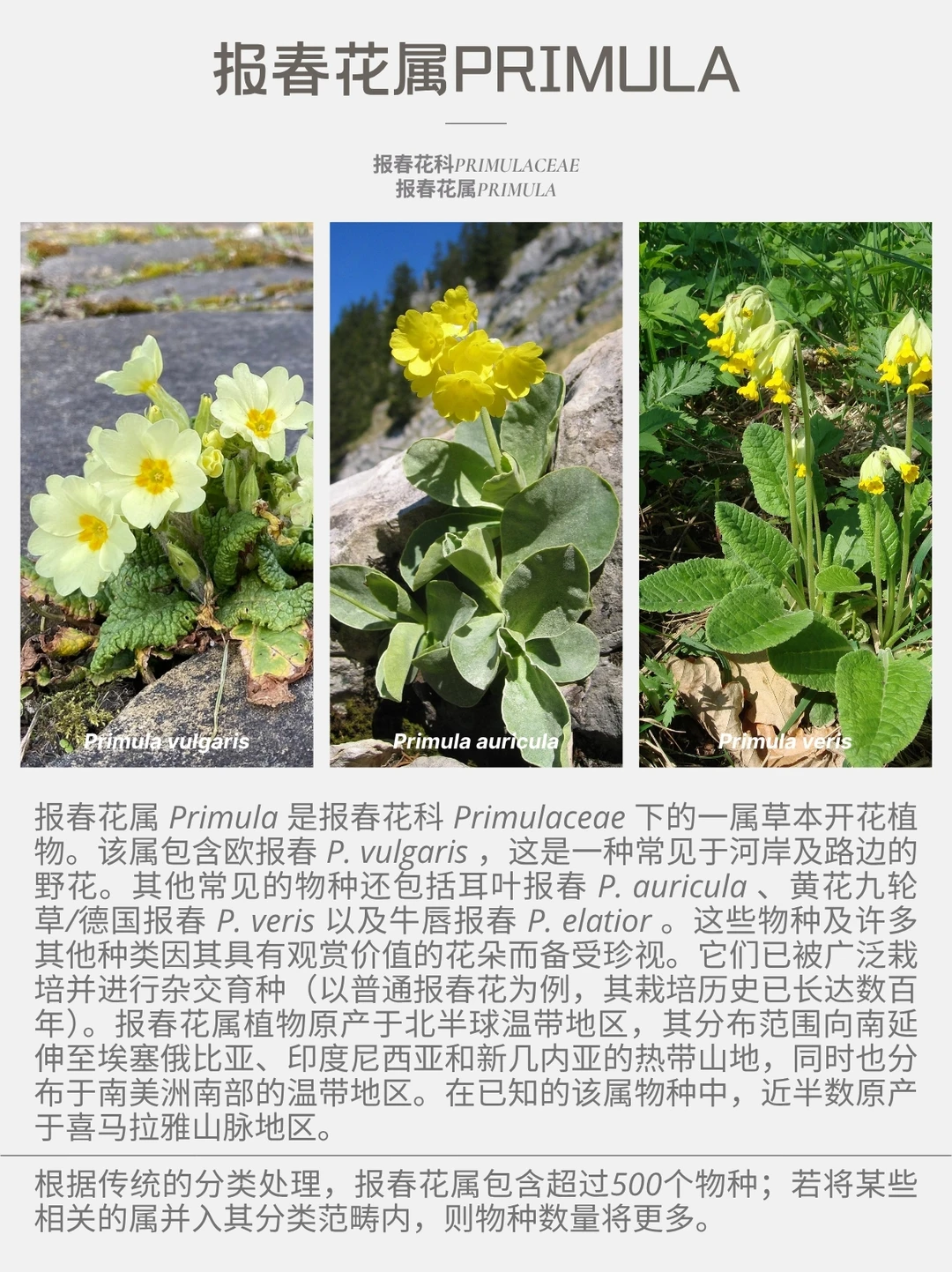 根据传统的分类处理,报春花属包含超过500个物种;若将某些相关的属并入其分类范畴内,则物种数量将更多。