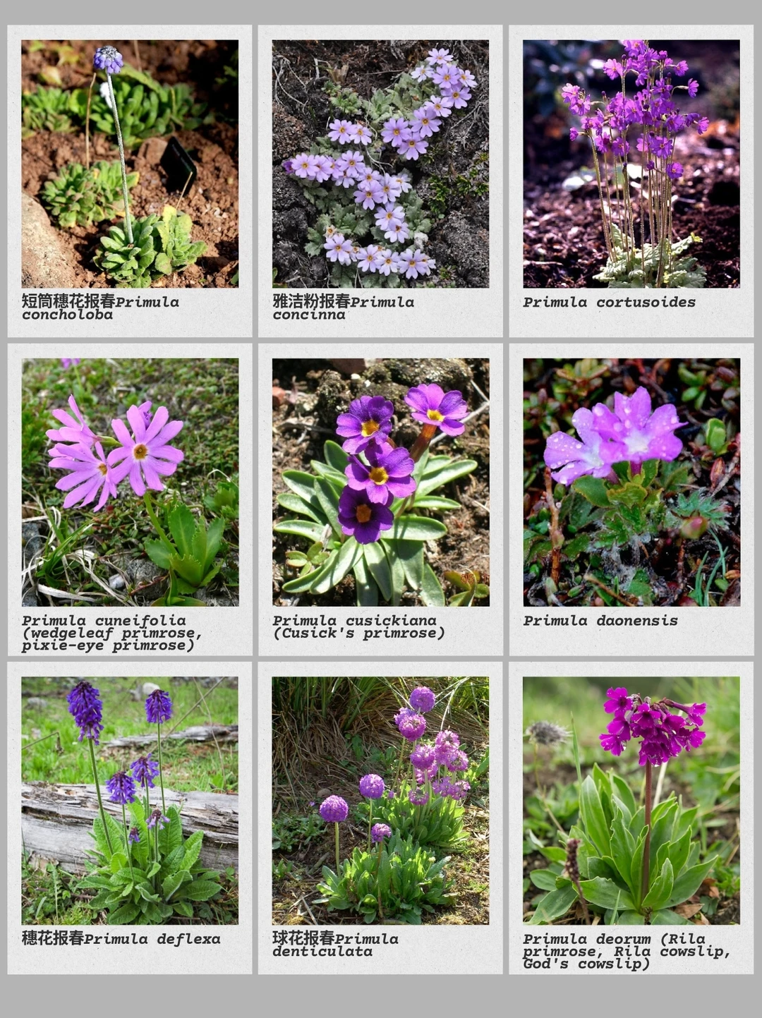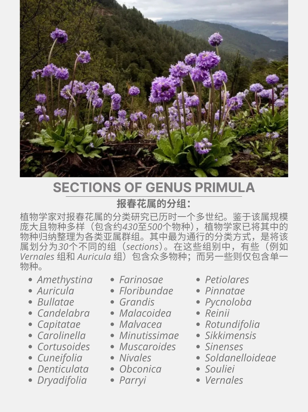 报春花属是一个复杂且多样的属,其生境范围广泛,从高山坡地到沼泽草甸均有分布。该属植物大多在春季开花,花朵常呈球状伞形花序,着生于从基生叶丛中挺拔而出的粗壮花茎顶端;花色丰富,涵盖紫色、黄色、红色、粉色、蓝色或白色。部分物种的植株各部位表面会附有一层白色的粉状物。许多物种均已适应高山气候环境。