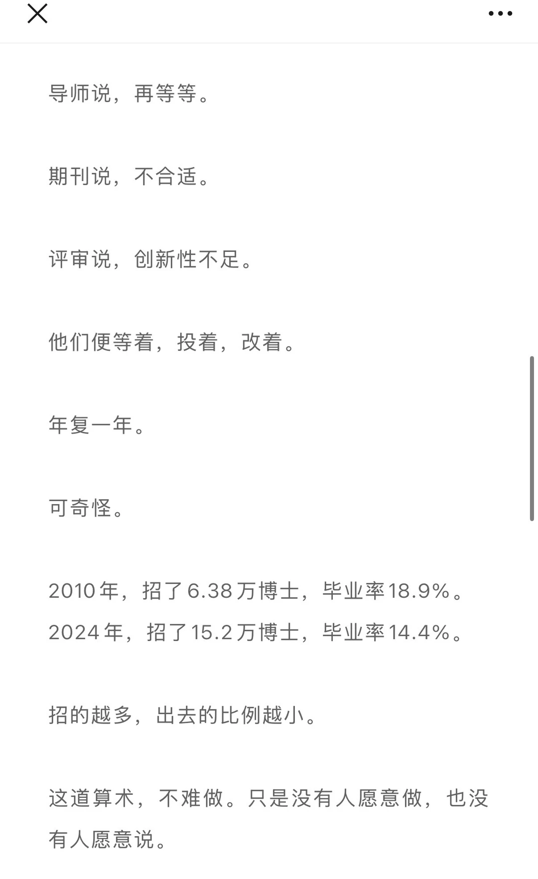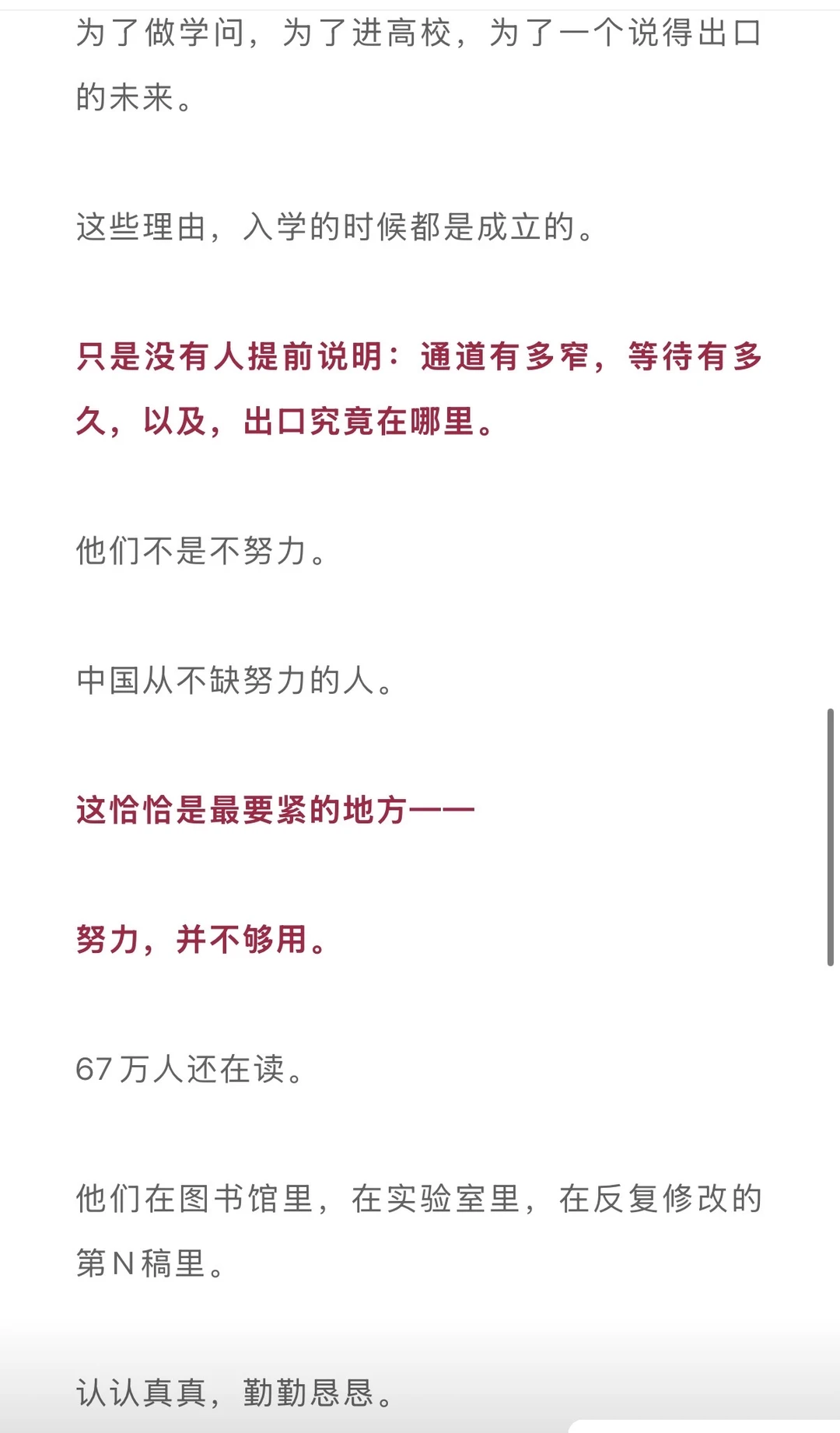 入学时二十五六岁,读完出来,快三十了。三十岁的人,做着二十岁的事,拿着比二十岁更少的钱,对着一篇论文,改了又改,改了又改。