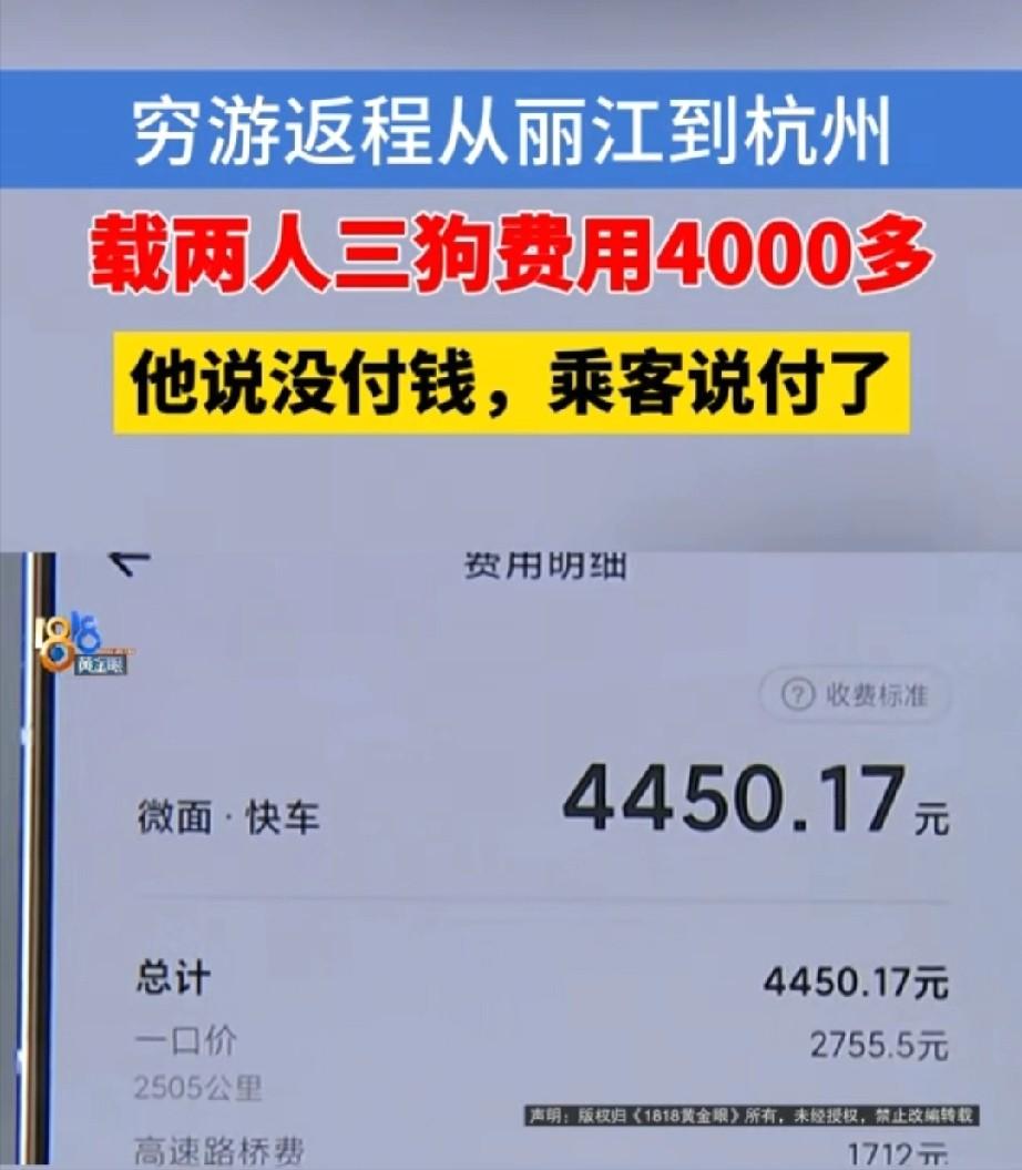 想白嫖?浙江杭州,男子开着面包车自驾游,到达丽江时,为了节省路费,他在货拉拉平台上接了一个从丽江到杭州的回程单,两名女顾客带着三条大狗,还有不少露营装备,塞满了大半个车厢。男子开了两天两夜,高速费加服务费总共是4450多元。将两人安全送到家后,女子说钱已经提前支付给了平台,半个小时内他就能收到。男子信以为真,直接走了,但苦等好几个小时,连钱的影子都没见着。他急了,赶紧找平台确认,谁知,平台却给出了截然不同的说法。 薛先生盯着手机看了又看,屏幕安静得有点刺眼。 杭州已经是深夜了,车停在路边,刚洗过,水痕还没干。那笔说好“半小时内到账”的钱,却迟迟没有动静。两天两夜,2505公里,4450.17元,最后落在他手里的,只有一句轻飘飘的“你等一下”。 这事听着离谱,可偏偏就这么发生了。他原本只是想给自己的川藏穷游收个尾。旧面包车陪他跑了高原,也翻了山,回程走到丽江时,他琢磨着,空车往苏州方向走也是走,不如在平台上接个顺路单,多少把油费和过路费摊一摊。 单子很快来了,从丽江到杭州。对方是两名女子,还带着3条狗,外加露营用的杂物和行李。面包车本来就不宽裕,这么一塞,后厢几乎满了。按常理说,这种单子不算轻松,可薛先生还是接了。他图的不是发财,就是少亏一点。 21号出发后,这趟路比想象中更熬人。2500多公里,几乎是硬扛过去的。乘客想歇脚,他就找服务区。狗要下车透气,他也配合停车。路上,对方还给他买过一瓶红牛。就是这种小动作,最容易让人放下防备。你会觉得,挺客气的人,不至于在车费上动歪心思吧? 结果,偏偏就是这一步,踩空了。23号到杭州,薛先生把两人分别送到地方。账也算出来了,高速、服务加在一起,4450.17元。 最后下车的女子很镇定,说钱已经交给平台了,系统结算需要一点时间,大概半小时就能到。她还补了一句,现在再付,平台可能会重复扣款。 这话拿捏得很准。既给了一个具体时限,又顺手堵住了“当场付款”的路。薛先生信了。人走了,他去洗车,心里甚至没太当回事。可等洗完车,再看手机,还是没有任何入账提醒。又过了几个小时,还是空的。 这时候,人一下就清醒了。他赶紧联系对方,对方甩来一张截图,说钱早在3月18日就从余额宝扣掉了。看上去像模像样,金额也对得上。 问题是,薛先生越看越不对劲,18号他还没出发,21号才从丽江上路,23号订单才结束,连高速到底要花多少都还没跑出来,怎么可能在18号就“精准预付”了4450多元? 真正把这层窗户纸捅破的,是平台客服。 薛先生一核实,平台那边给出的答复很直接:这笔钱并没有付成功,后台显示客户取消了支付。说白了,就是车坐完了,人到了,付款这一步被撤了。那张所谓“已付款”的截图,和平台记录根本对不上。 事情走到这儿,性质就变了。 如果只是临时手头紧,完全可以商量。如果只是系统延迟,也有后台可查。可一边取消支付,一边告诉司机“钱已经到了平台”,再拿出一张时间上前后打架的截图来稳住人,这已经不是简单的拖欠,更像是一步一步算好的。 后来记者上门,对方连门都不开。隔着门,她还是那套说法:钱已经给了,你去找平台。语气还很硬,不服就报警,不服就起诉。记者想继续问清楚,她又把话一甩,说自己要睡觉,再敲门就报警说有人骚扰。 你看,这个场面特别荒唐。真正跑了两天两夜的人,在车里收拾别人落下的衣物和被褥。真正没拿到钱的人,还得盘算自己在杭州多待一天要多花多少食宿费。倒是那个没付款的人,底气足得很,好像自己才是被打扰的一方。 从法律上看,事情其实不复杂。平台接单,司机承运,把人和物安全送到约定地点,这就是一份运输服务关系。薛先生的义务已经履行完了,对方就该按约把钱结清。不给钱,就是违约。继续支付运费,再补上合理损失,这本来就是最基本的后果。 薛先生后来打算先回老家,不再继续耗在杭州。 这个决定很现实。人总得吃饭,总得睡觉,总不能为了讨一笔本该属于自己的钱,把成本越滚越大。平台后续会不会垫付,钱最后能不能追回来,当然重要。但在这件事里,最该被记住的,其实不是那两个名字,而是那个深夜里迟迟没有跳出来的到账提醒。 一个安静的零,照出了这场“免费专车”背后的全部算盘。 也提醒所有人一句:跑完长途,别急着让人走。平台结算,别只听口头。该点开的页面,当场就点开。不是人心都坏了,是有些人,专挑老实人下手。 信息来源:浙江电视台(1818黄金眼官方) 2026-04-0115:34 穷游载俩乘客