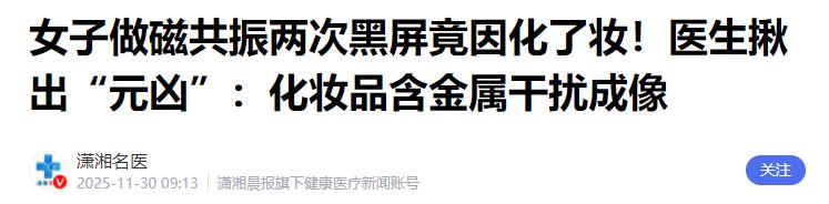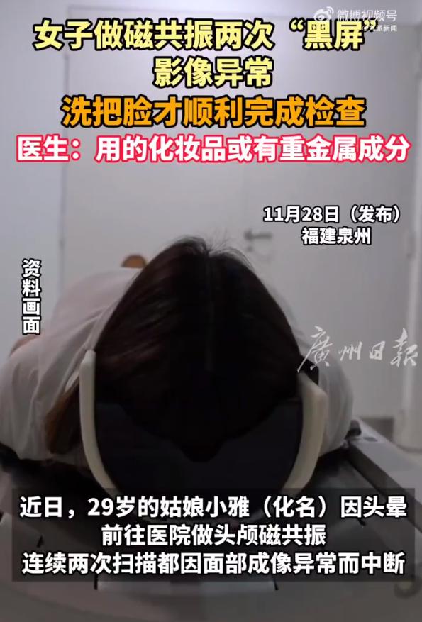 解释不清了!福建一位 29 岁女生因头晕前往医院做头颅磁共振检查,本想快速查清头晕的病因,却接连遭遇两次扫描中断,面部成像全程异常无法使用。 医生逐一排查假牙、纹眉、整形等常见干扰因素后,终于找到问题根源 —— 既不是体内植入物,也不是佩戴的金属饰品,而是日常使用的化妆品,成了这次检查受阻的 “隐形元凶”。 2025 年 11 月,福建泉州这名 29 岁女生小雅(化名)因持续头晕不适,在医生建议下前往福建医科大学附属第二医院做头颅磁共振检查。 按照磁共振检查的常规要求,她提前摘除了耳环、项链、发夹等所有外露金属饰品,也将手机、钥匙、银行卡等物品妥善存放,做好了全部准备工作。 可当她躺进检查仪器开始第一次扫描时,刚启动第一个序列,仪器就出现明显异常,面部区域的成像直接出现大片发黑、模糊的金属伪影,影像数据完全无法用于诊断,检查只能被迫中途停止。 在场医生起初以为是体位摆放、设备调试的小问题,让小雅调整姿势后重新进行第二次扫描,结果和第一次毫无差别,依旧因面部成像异常导致扫描中断。 连续两次检查失败,不仅浪费了检查时间,也让小雅和医护人员都十分困惑。放射科医生开始细致排查所有可能的干扰原因,先询问小雅是否佩戴假牙,得到否定回答后,又追问是否有纹眉、面部整形等操作,小雅也都一一摇头否认。 就在排查陷入僵局时,医生注意到小雅脸上化着日常淡妆,涂抹了粉底液、定妆散粉,还有基础眼妆,当即判断问题大概率出在化妆品上,建议她立刻彻底卸妆后再重新检查。 小雅随即前往卫生间,用洁面产品将面部妆容彻底清洗干净,擦干后第三次躺上检查床。这一次磁共振扫描全程顺畅,头面部成像清晰完整,没有出现任何伪影与干扰,顺利拿到了可供诊断的有效影像。 事后医护人员对比了卸妆前后的检查影像,卸妆前的图像面部区域大面积发黑扭曲,完全看不清组织结构,卸妆后的图像则层次分明、细节清晰,两者差异十分明显。 很多人觉得化妆品和磁共振检查毫无关联,这其实是对检查原理的常见误解。磁共振设备依靠强磁场与人体氢原子核的共振作用成像,目前医院常规使用的 3.0T 磁共振,磁场强度是地球自然磁场的数万倍,对金属物质的敏感度极高。 市面上绝大多数彩妆产品,包括粉底液、眼影、定妆散粉、带闪粉的彩妆等,为了提升遮瑕效果、光泽质感与持妆时长,都会添加氧化铁、钛白粉、云母等金属氧化物或矿物微颗粒。 这些微量金属成分肉眼难以察觉,日常使用不会对皮肤造成伤害,但进入磁共振的强磁场环境后,会直接破坏磁场的均匀性,引发局部磁场紊乱,最终导致扫描区域出现大面积伪影,轻则影像模糊无法诊断,重则直接造成扫描中断,这也是小雅两次检查失败的核心原因。 需要明确的是,化妆品中的金属微颗粒不会像铁磁性金属那样被磁场强力吸附引发安全风险,但对成像质量的破坏十分明显,极易延误病情排查。 除了普通彩妆,纹眉、纹身所用的颜料、染发剂中的金属成分,同样会对头颅、面部磁共振成像造成干扰,这也是医护人员检查前反复确认纹绣、染发史的原因。 进入 2026 年,上海市卫生健康委员会、广东省人民医院、临沭县人民政府等官方机构与医院,均在磁共振检查科普中明确提醒:做头面部、颈部磁共振前,必须彻底卸妆,禁止使用唇膏、眼影、睫毛膏、粉底液等含金属成分的彩妆,染发剂残留、含金属的外用膏药也需提前清理干净。 不少人存在检查误区,认为只化淡妆、用素颜霜就不会有影响,实则哪怕是轻薄的底妆,只要含有金属成分,就可能干扰磁场。 还有人只重视摘除外露金属饰品,忽略皮肤表面的化妆品残留,这也是临床中磁共振检查失败、需要重复检查的常见原因。 这次福建女生的经历,也给所有需要做磁共振检查的人提了醒:医疗检查的各项准备要求,并非多余的繁琐流程,而是保障检查安全、成像准确的关键。 磁共振检查的禁忌与准备,核心是为了避免磁场干扰、保证诊断精准,既能减少重复检查的麻烦,也能防止因影像异常漏诊、误诊病灶。 尤其是针对头颈部的磁共振检查,提前在家彻底卸妆、清理所有与金属相关的外用产品,严格遵从医护人员的指引,才能一次性顺利完成检查,快速明确病因、及时开展后续诊疗。看似不起眼的卸妆步骤,在磁共振检查中,恰恰是保证检查成功的重要一环。