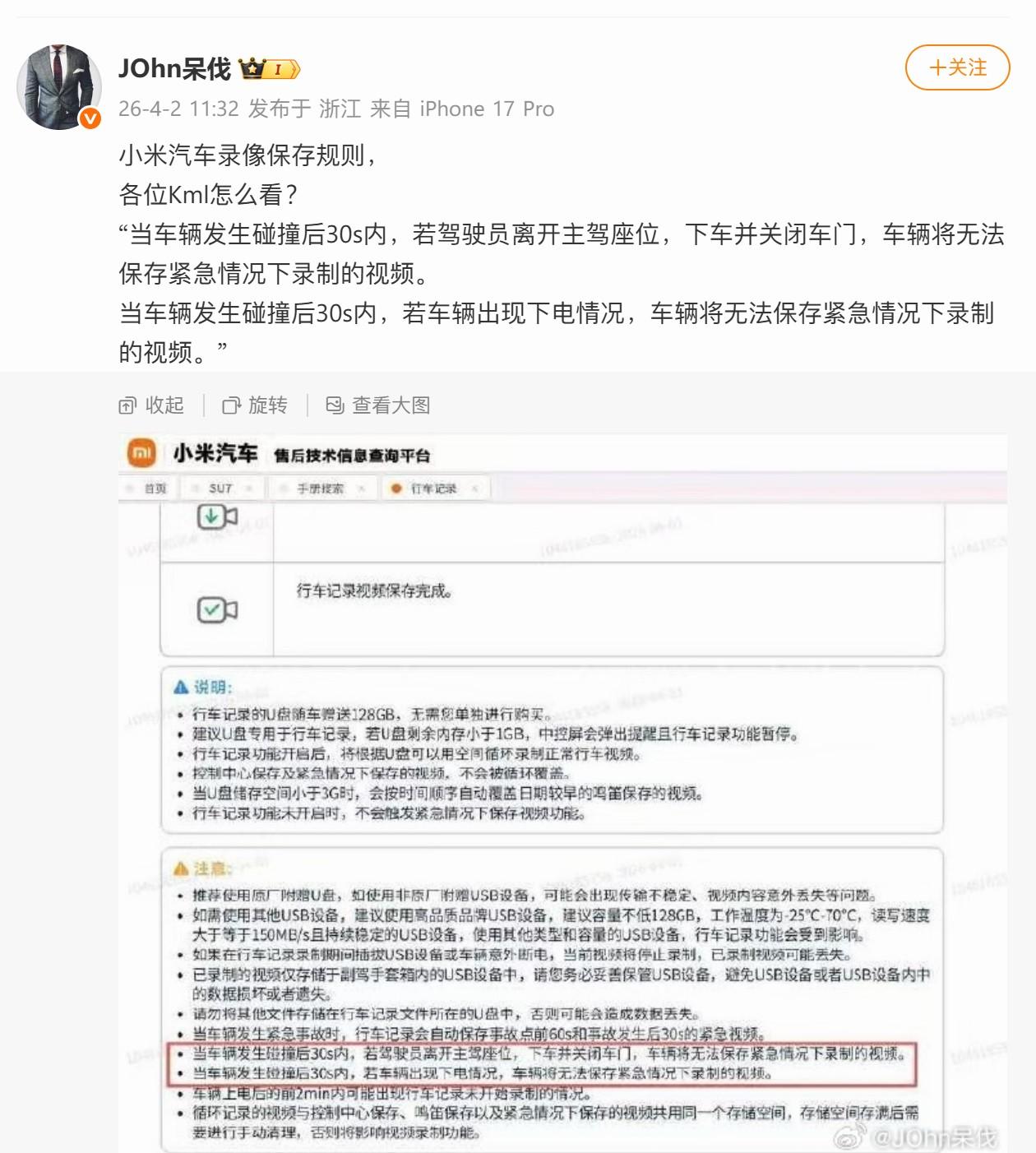 这个小米汽车行车记录仪被“精准删掉”的视频我也刷到了,还有这个@JOhn呆伐 发的图很模糊,我看到的第一感觉是不太可能,首先行车记录仪就是正常完整记录视频的,行车电脑怎么可能会判断事故视频就删掉,那有点太扯了;其次行车记录仪视频“被删”通常只有一种可能只和存储介质有关系,要么是被循环覆盖(紧急视频应该会被锁定短期内不会被正常循环视频覆盖),要么是TF卡或者U盘存储损坏(取决于你买的U盘质量)。 不过他图一这个很模糊的图我还真认真的搜了一下,官方确实是这么说的,可见图1(水印我F12自己去掉了,正常截图会显示你的小米ID),“当车辆发生碰撞后30s内,若驾驶员离开主驾座位,下车并关闭车门,车辆将无法保存紧急情况下录制的视频”,官方网址在这里:tis.ev.xiaomi.com/ 只要有小米账号即可登录查看,这帮网友也是,普通人能知道这个网址吗?真6 确实有这条,按理来说,行车记录仪视频跟你下车关闭车门为啥还有关系呢?这点不是很懂,汽车博主们可以说一说,现在数码博主对于新能源汽车有太多东西需要学习了,传统油车我根本不知道还有这种规则,但我估计很多汽车博主也未必了解,我猜的啊,汽车博主们见谅。 那至于“精准删除”我觉得应该不存在,而且前面都有过很多起事故了,也没见哪个小米车主说记录仪视频被删了,刚看了下,该博主“王王王小贱”视频已下架,多半他自身有问题或者隐瞒了什么。 大家可以讨论下“30秒内下车关闭车门则无法保存紧急视频”,这条规则是基于什么汽车逻辑设计的? 看了下豆包解释,说这条规则是合理的,离车关车门会下电导致无法保存。这条规则默认是用户没有实体钥匙?且下车后手机蓝牙超出距离会导致锁车下电所以会终止录像? 反正我离车如果不想锁车的话会把星闪车钥匙或者卡片留在车上,这个规则存疑,不知道鸿蒙智行是不是同样的设计。